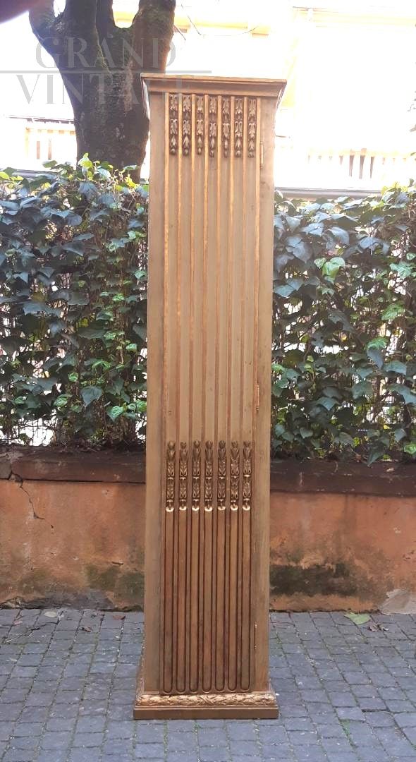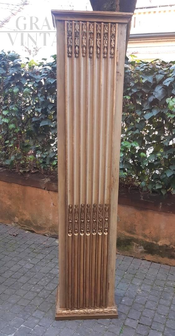Armadietto, piccola credenza o stipetto antico a colonna o a pilastro alto e stretto in legno dorato e laccato, mobile veneziano del '700, elegante ed inconsueto con frontale a colonna scanalato con canne d'organo ed inserti finemente intagliati. Il basamento presenta un capitello a corona d'alloro, un insieme curioso e di assoluta qualità.