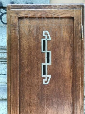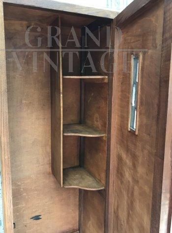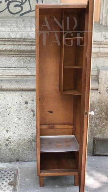 Stipetto o armadietto vintage di epoca art déco in legno di rovere ad un’anta con decorazione in ottone, completo di mensole interne.