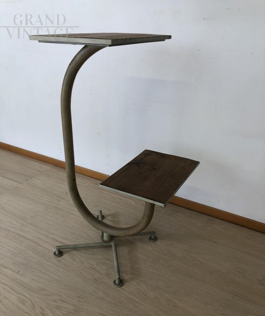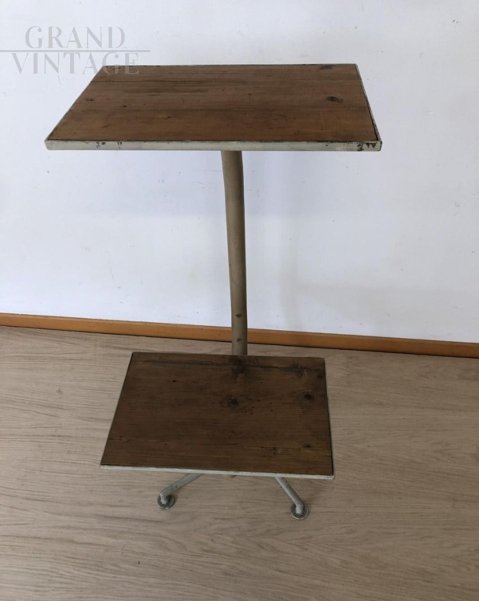 Struttura piedistallo vintage stile industriale in ferro con due ripiani in legno, utilizzabile anche come tavolino, porta tv o porta piante, anni '50.
