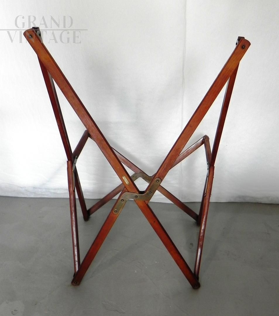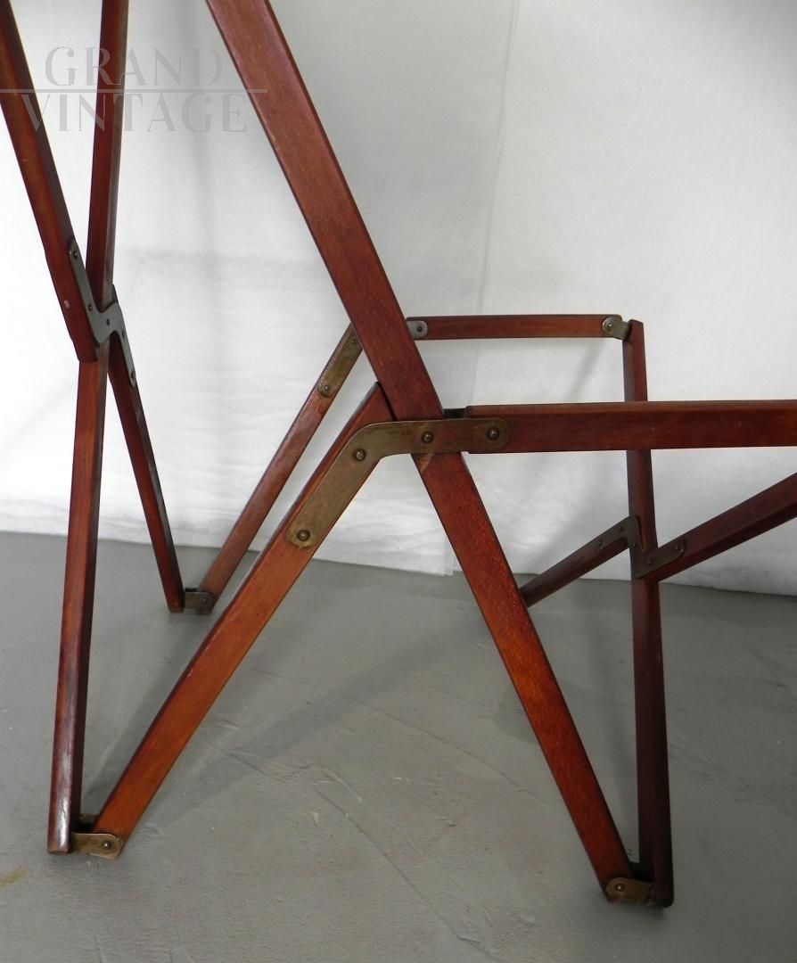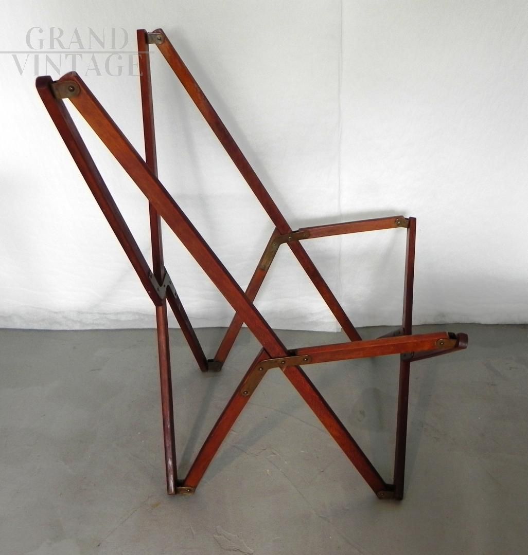 Struttura per poltroncina sedia richiudibile Tripolina sun deck proveniente da un transatlantico, marchiata Fuselli & Profumo, Genova anni '50. La struttura è in legno teak, parti metalliche sono in ottone.
