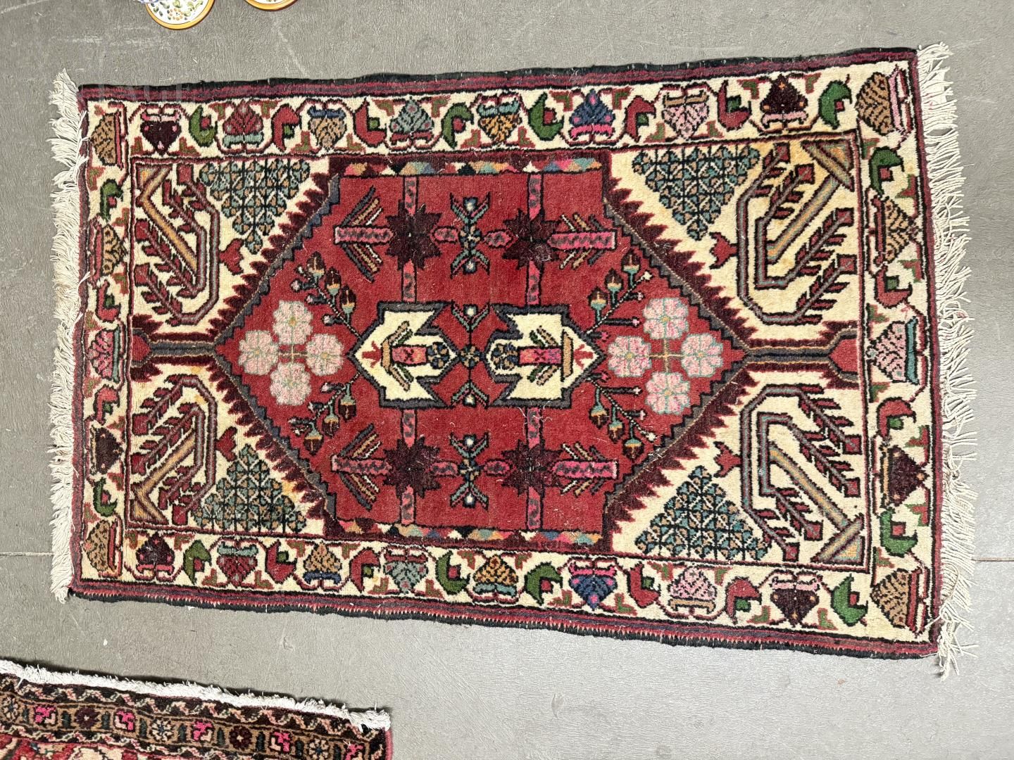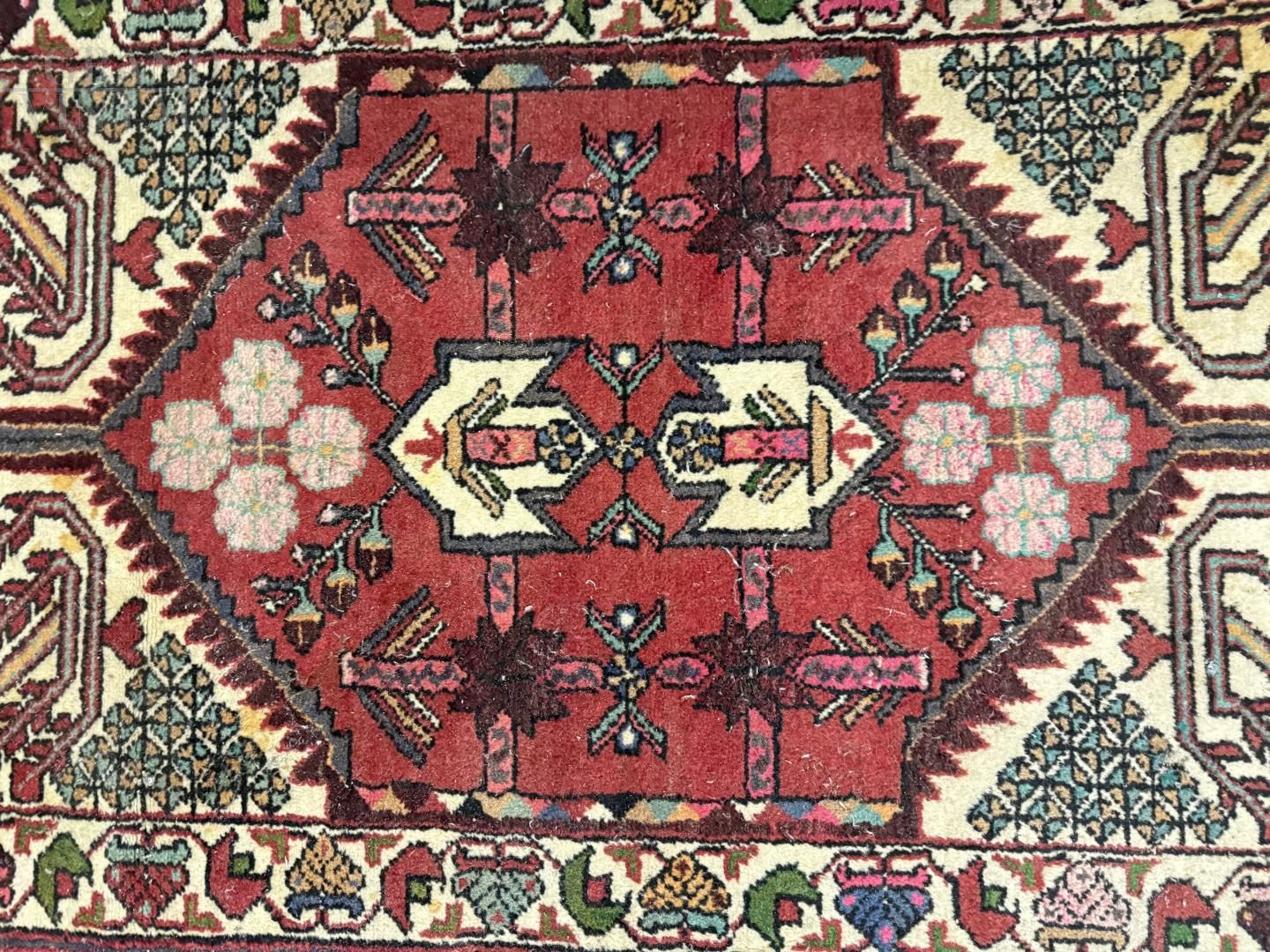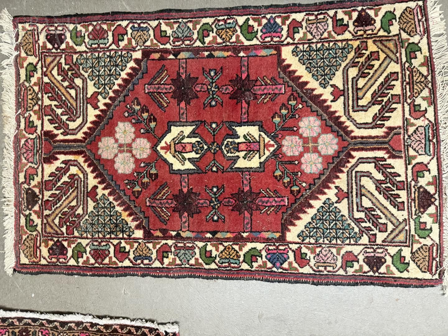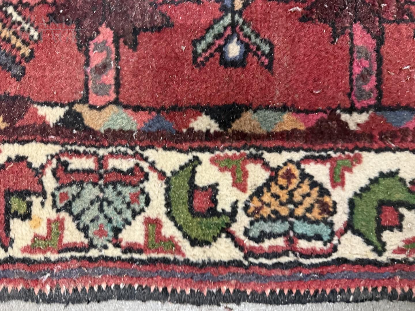 Tappeto persiano Hamedan nel tipico colore rosso con decorazioni geometriche e floreali, 128 x 84 cm, in ottimo stato.