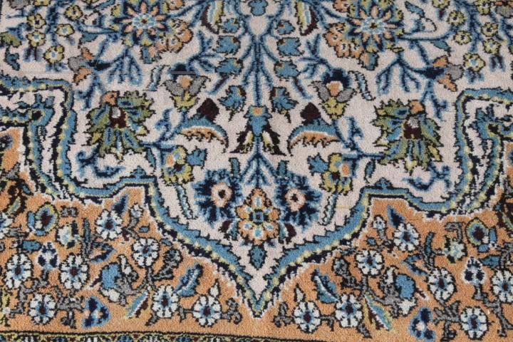 Bellissimo tappeto persiano di ottima qualità e manifattura Kum del XX secolo, realizzato con disegni molto fini e raffinati dei colori bianco, arancio, blu, giallo e azzurro. In ottimo stato, perfettamente conservato.