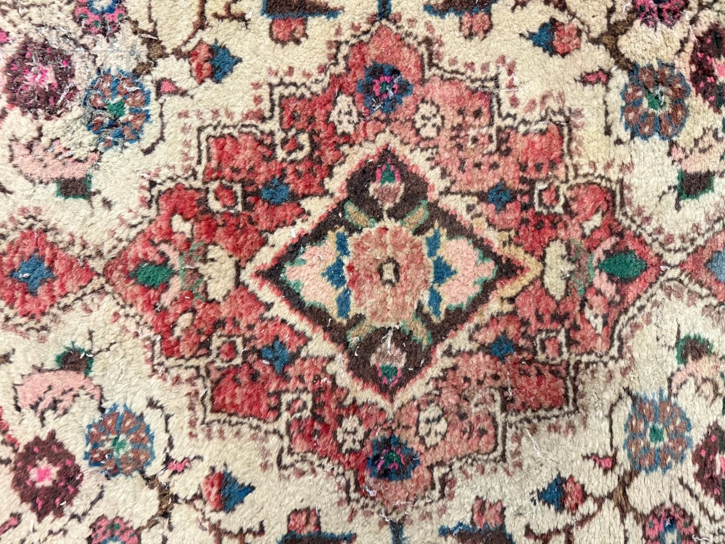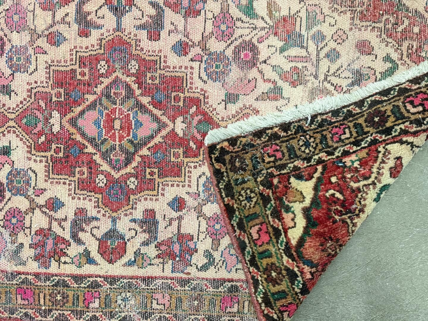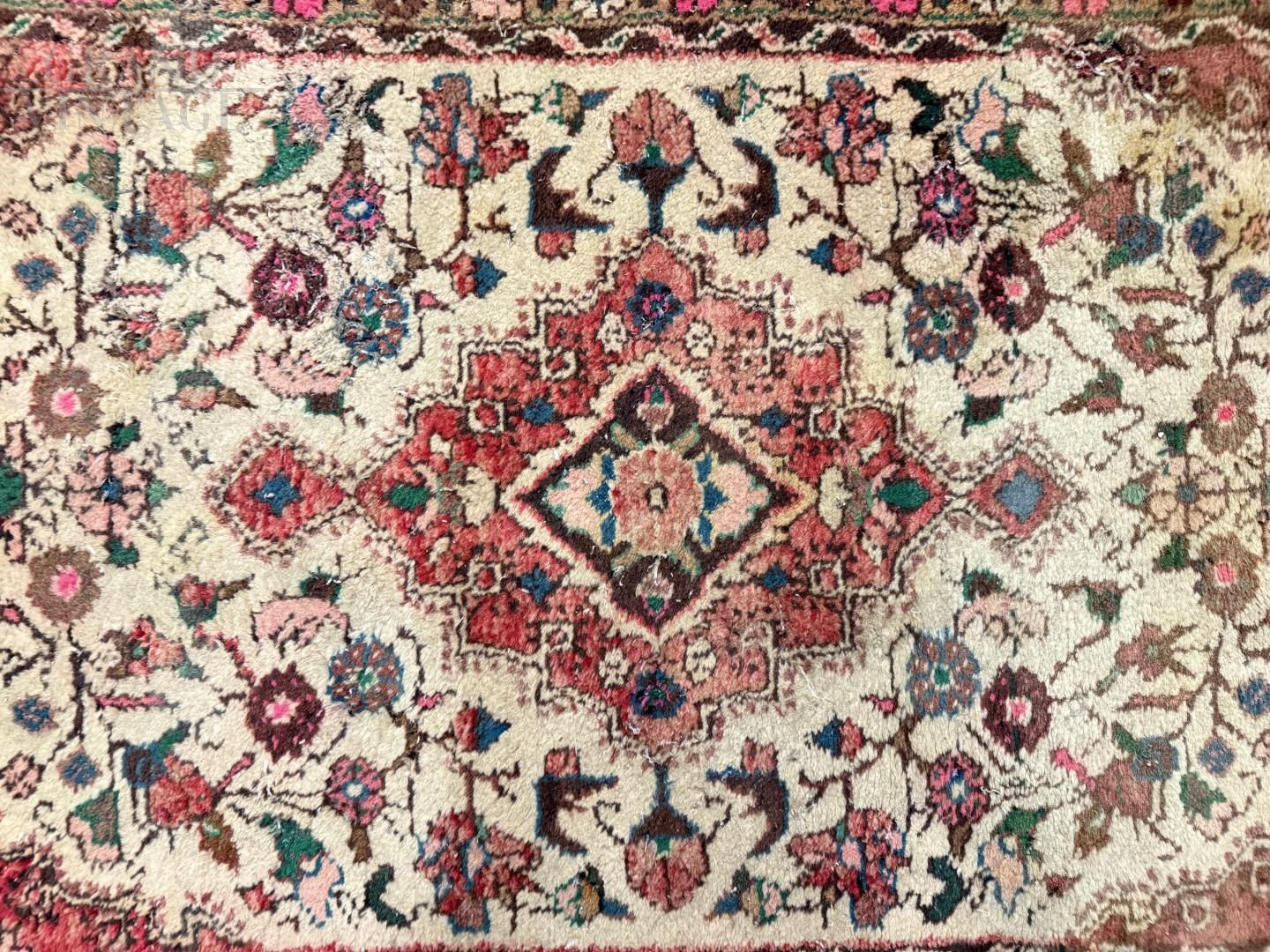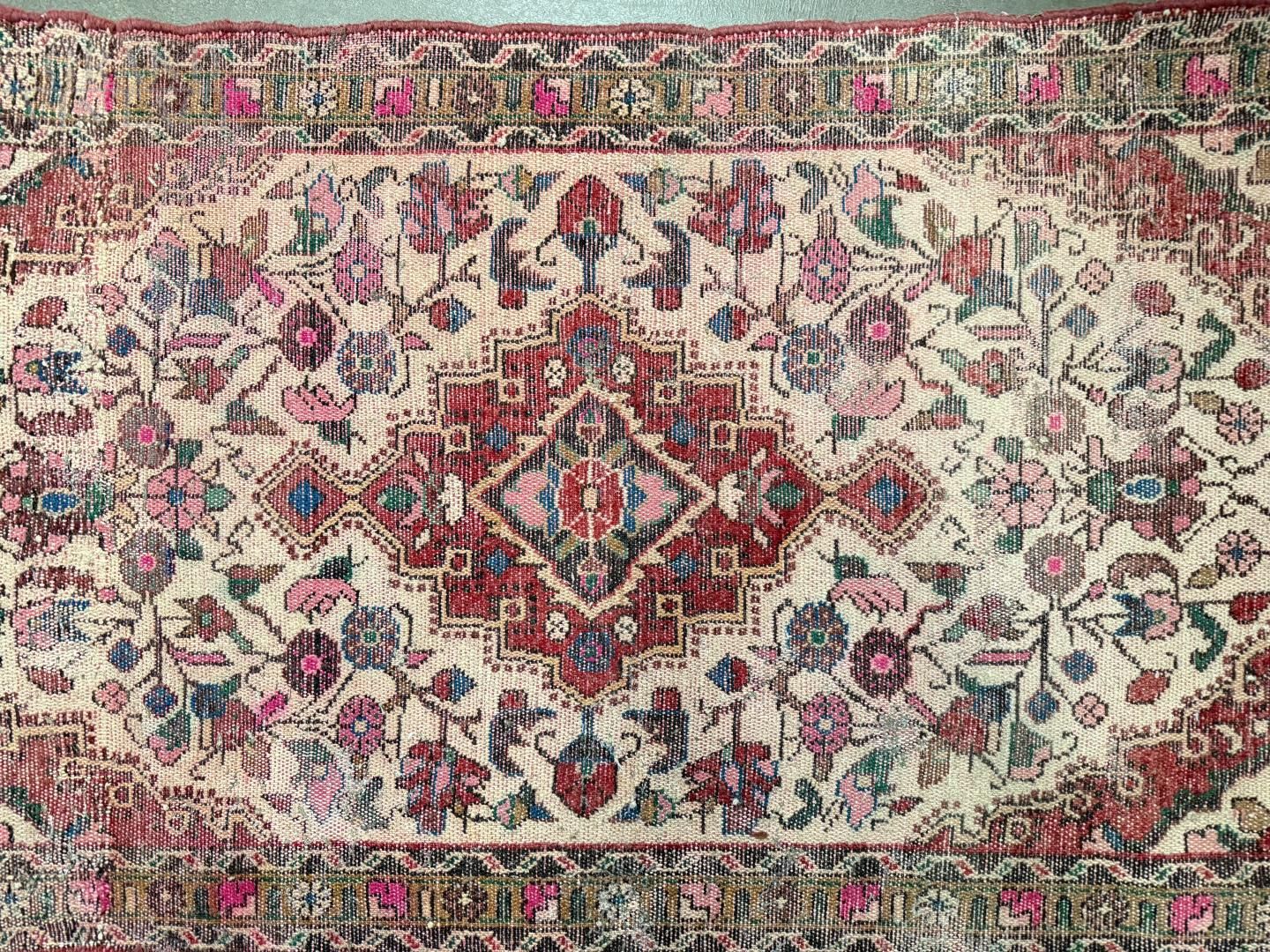 Tappeto persiano vintage con decori floreali rosa, 141 x 81 cm, in buono stato di conservazione, con difetti e usure dovute al tempo.