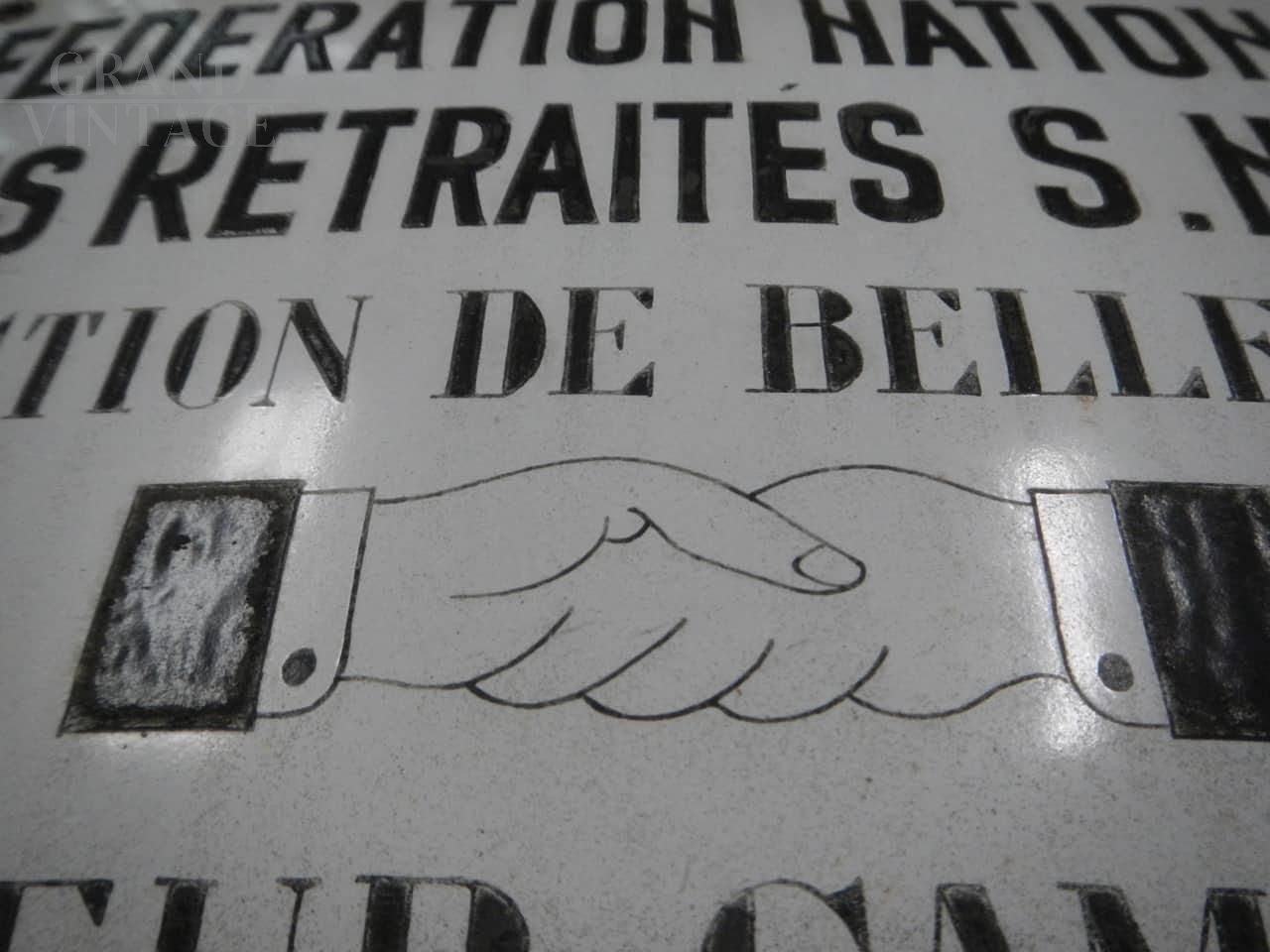 Targa vintage della Fédération Nationale des Retraités S.N.F.C., federazione nazionale dei pensionati di Bellegarde, realizzato in metallo bombato e proveniente dalla Francia degli anni '30.