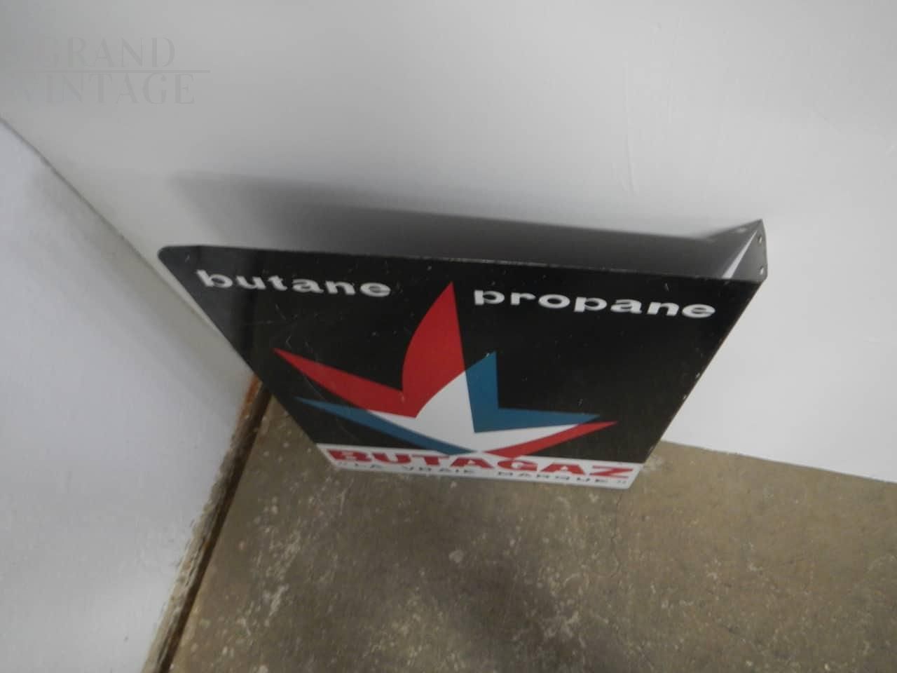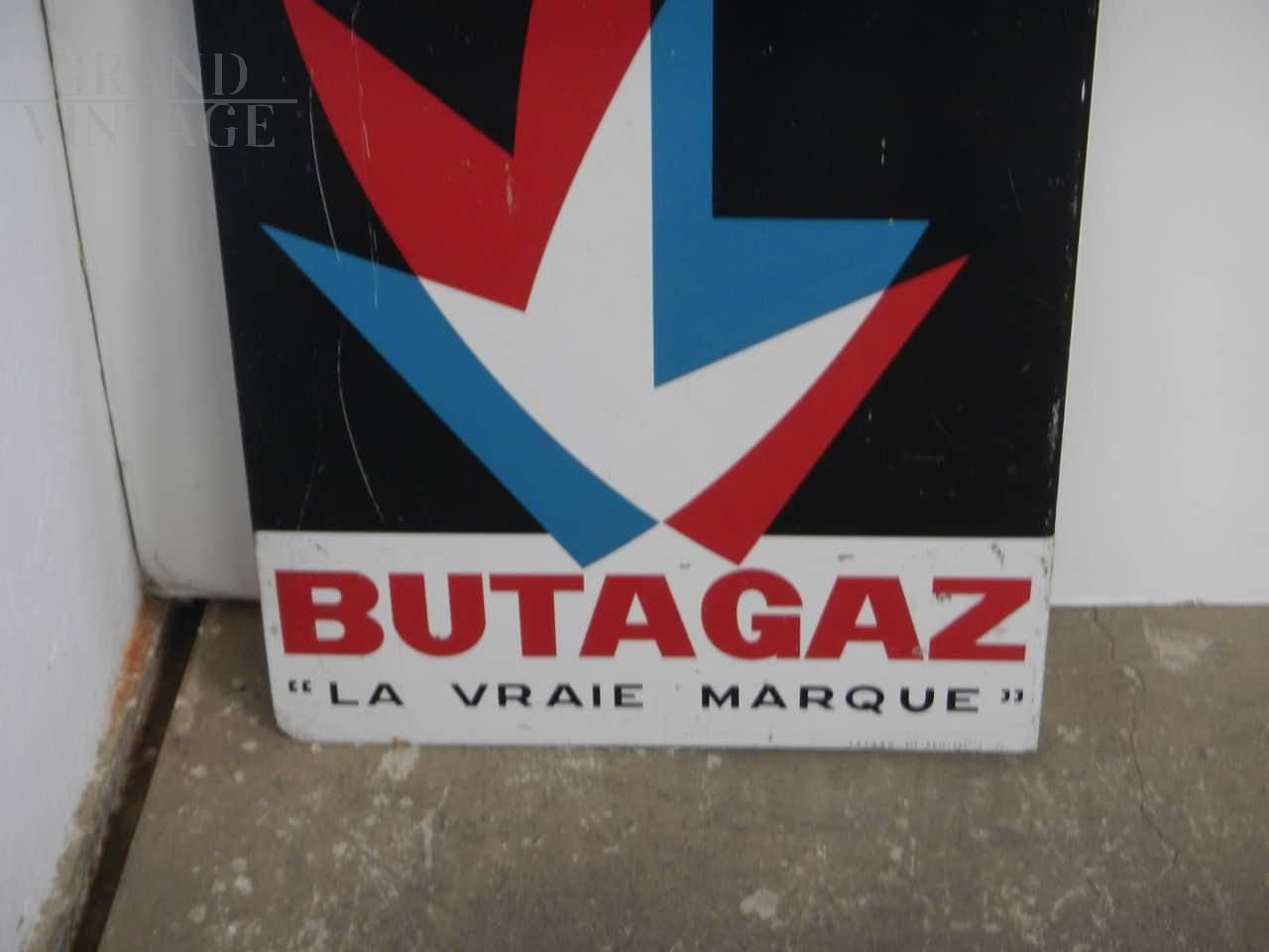 Insegna targa pubblicitaria francese bifacciale in metallo dell'azienda Butagaz, con sostegno laterale per appenderla, completamente originale.