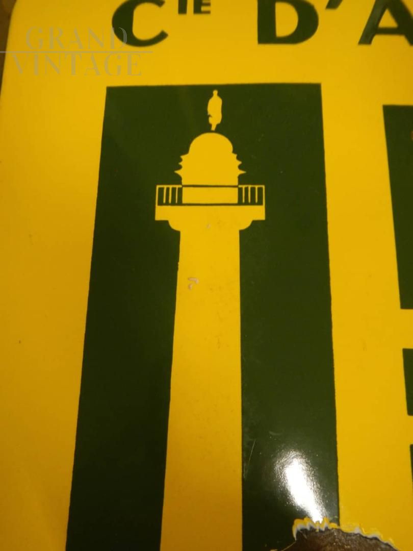 Insegna targa pubblicitaria vintage di agenzia assicurativa francese in metallo smaltato con scritta in nero L'Union Vie Assurances, 9 Place Vendôme – Paris su sfondo giallo. Completa di fori per appnderla al muro. Presenta segni d’uso consistenti, come da foto.