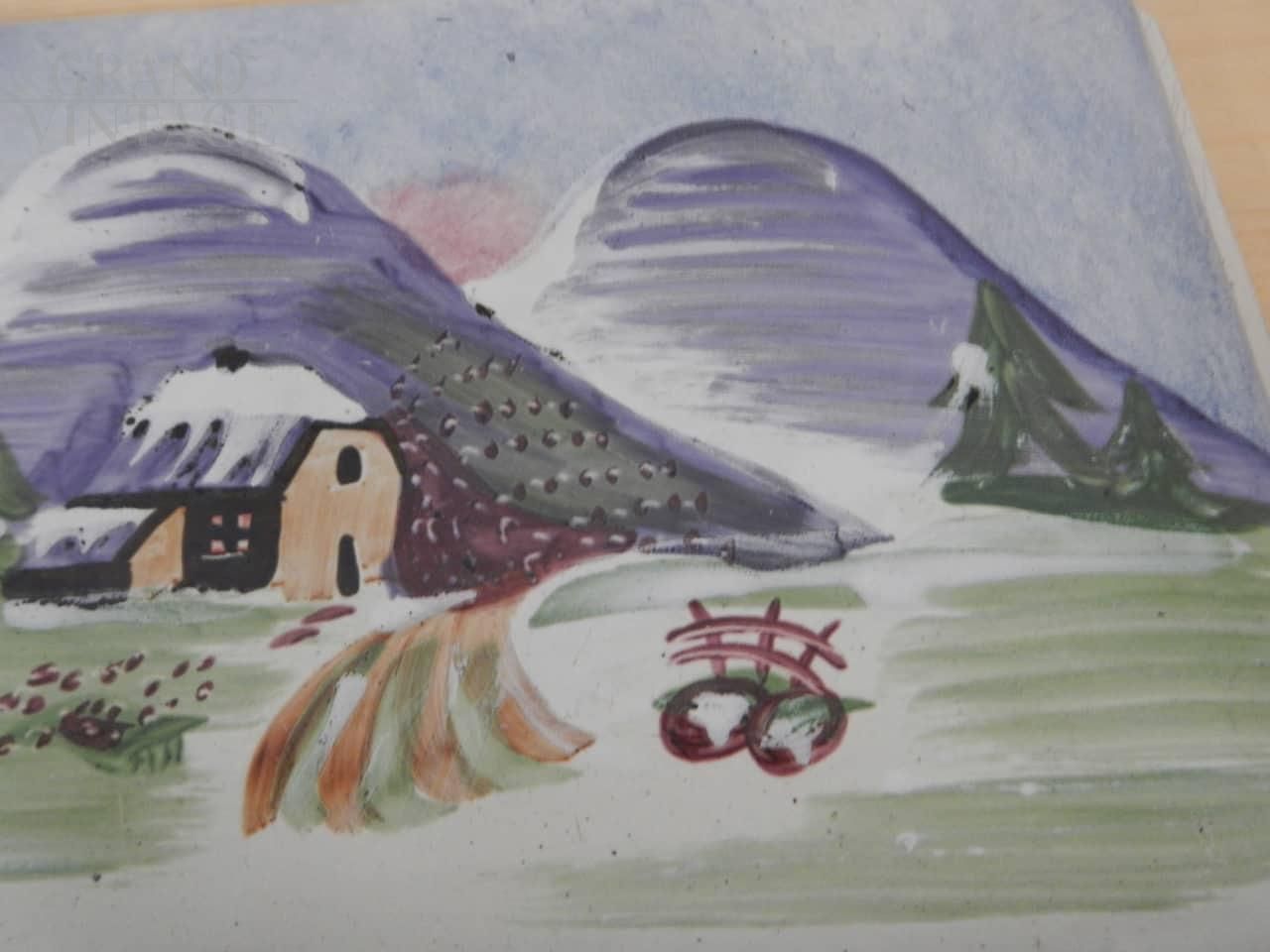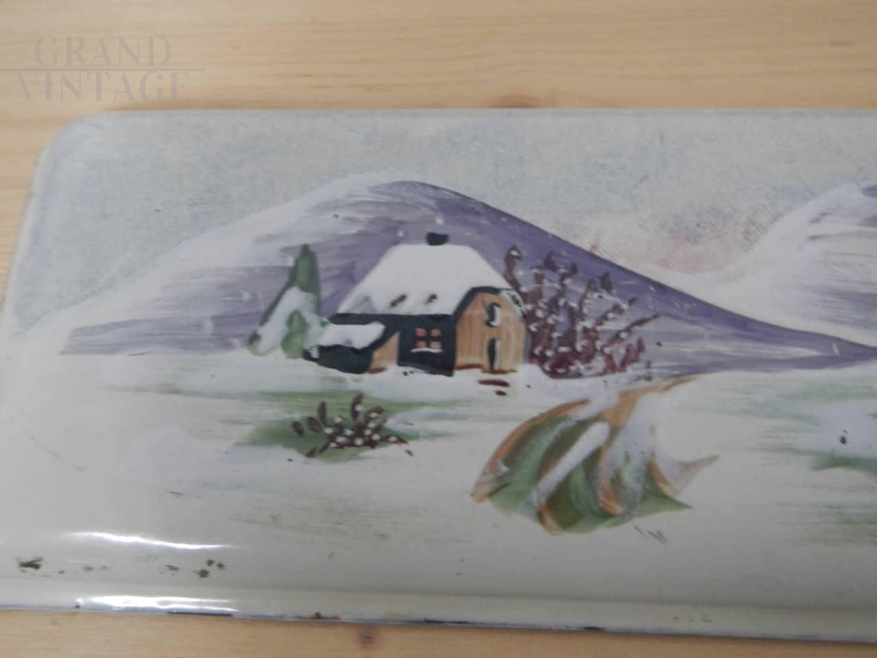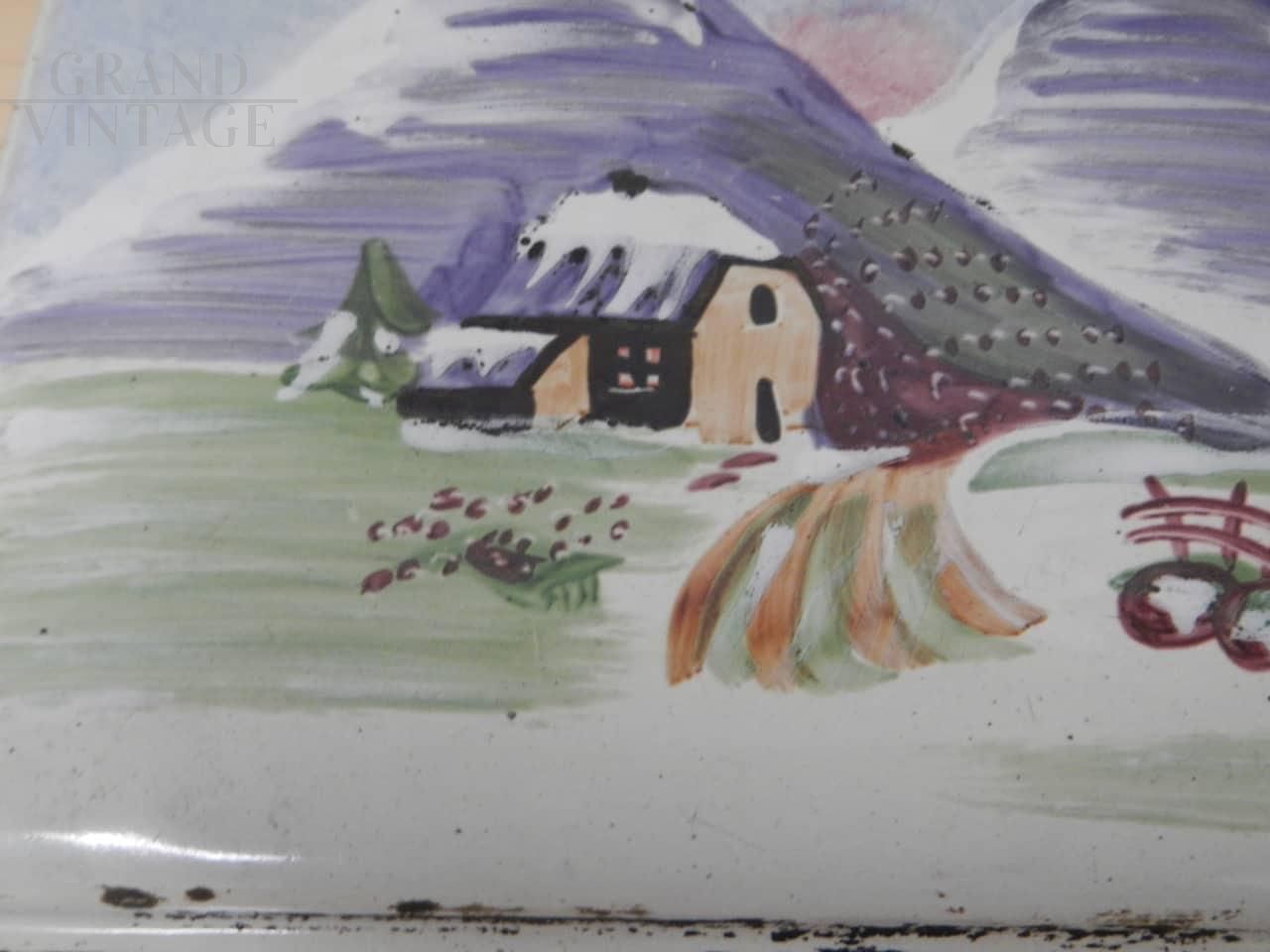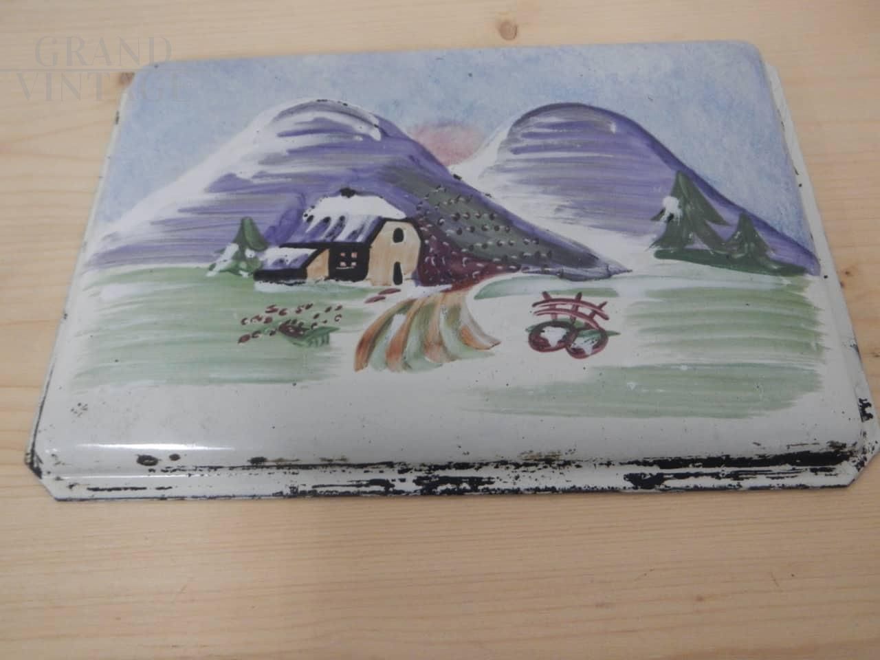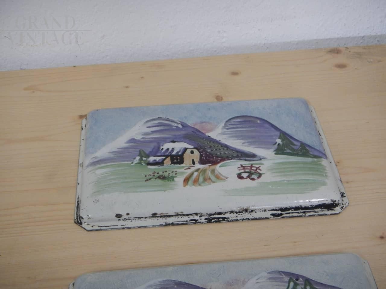 Coppia di targhette vintage in metallo dipinte con paesaggi di montagna, venivano usate come rivestimento per le porte da stufa a legna. Hanno due misure diverse: la più grande misura 21 x 28 cm, la più piccola misura cm 12 x 28 cm.