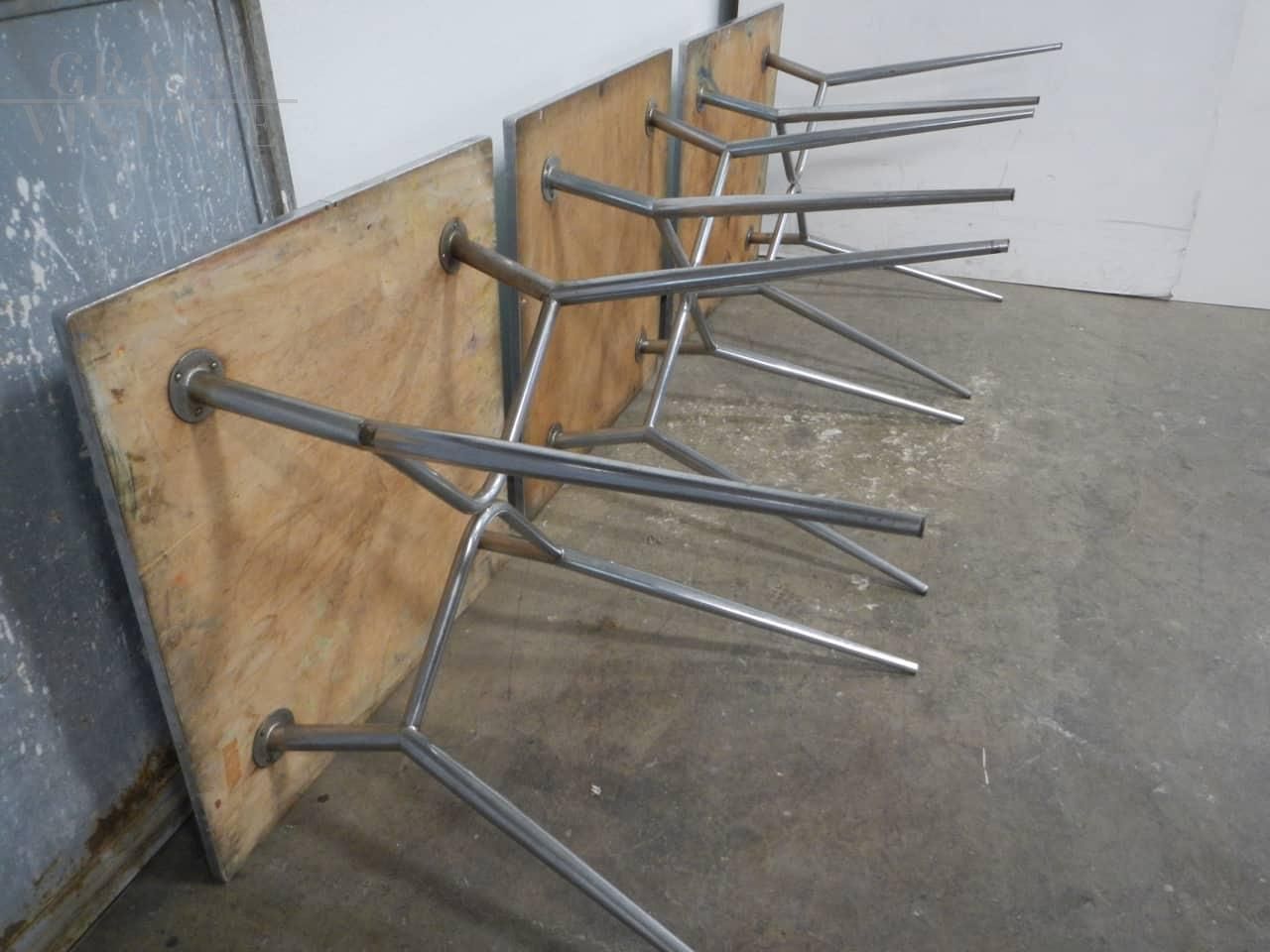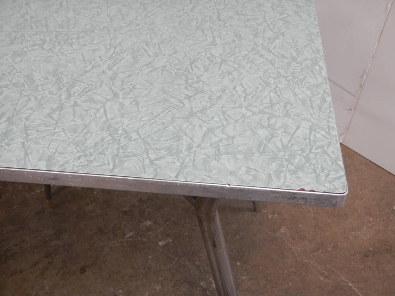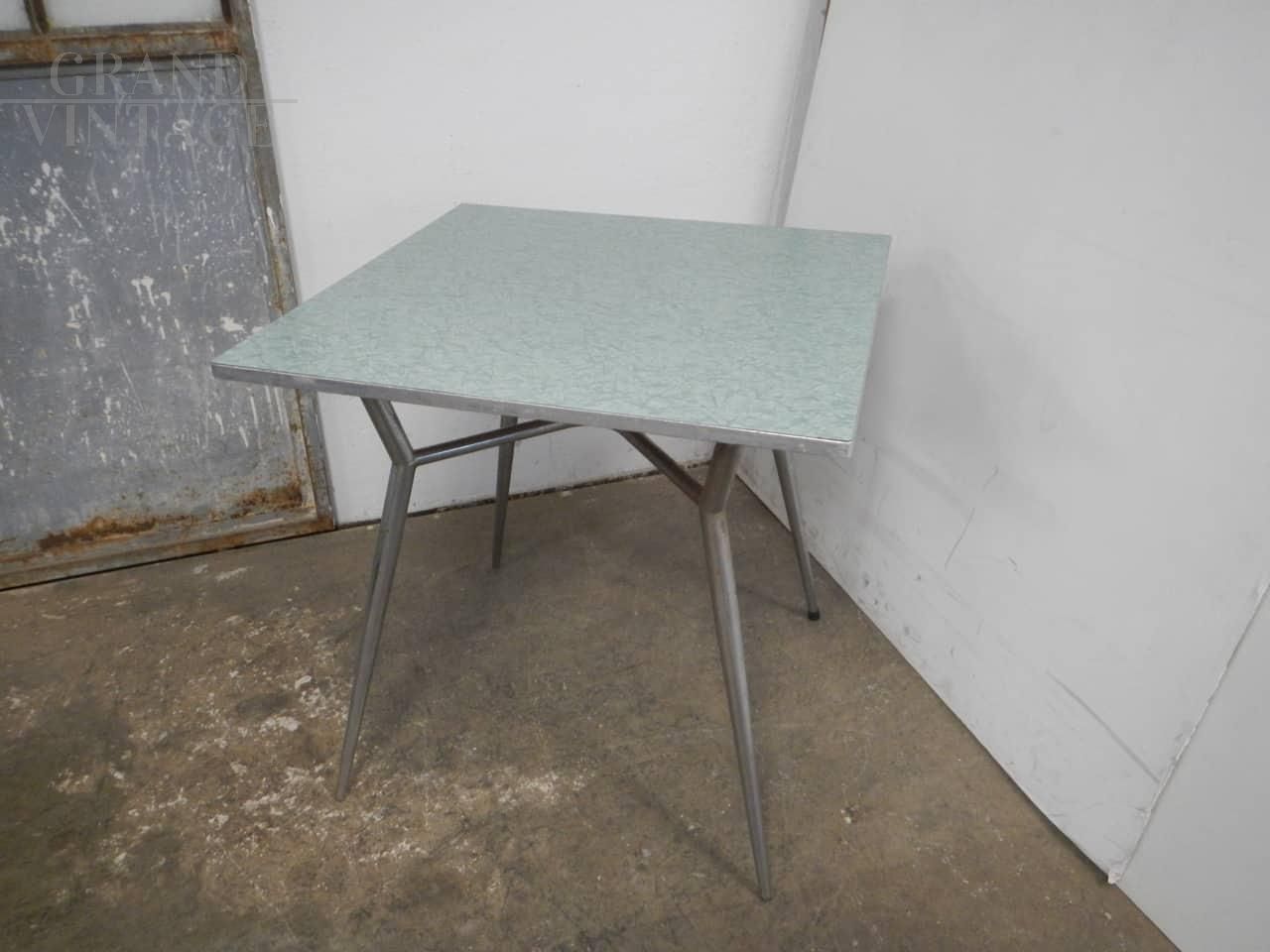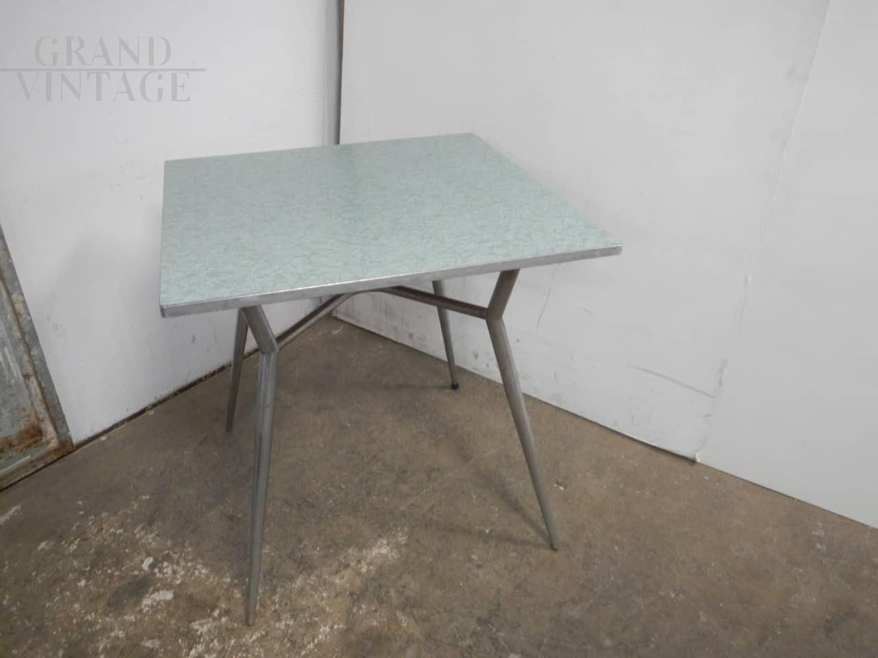 Tavoli o tavolini vintage quadrati in formica verde maculata con gambe in metallo cromato e bordo in alluminio, perfetti anche come tavolini da bar, in buone condizioni, con alcuni difetti come da foto. Disponibili 3 tavoli, il prezzo si riferisce al singolo pezzo.