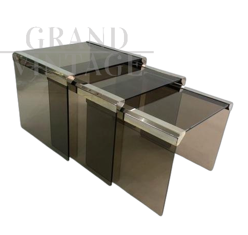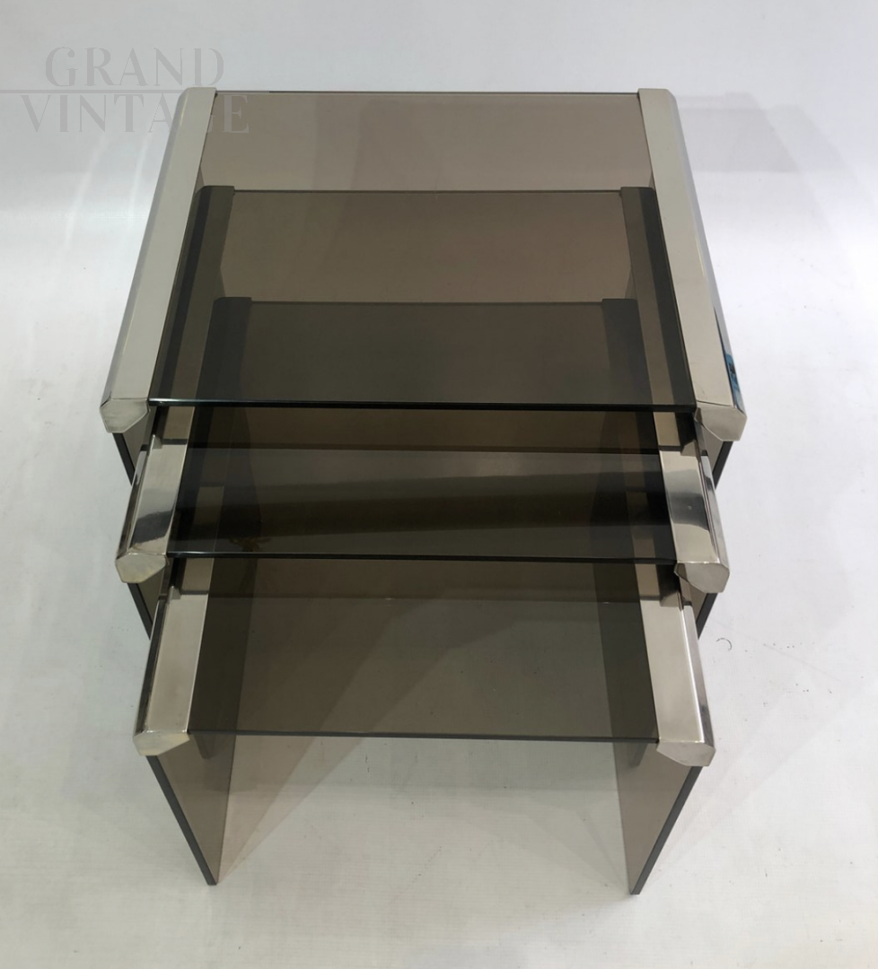 Tris di tavolini a nido di Gallotti Radice anni '80 in vetro fumé con cornice placcata in cromo in perfette condizioni, vetro intatto e senza difetti.