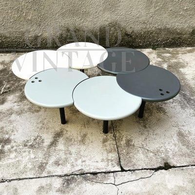 Tavolini modulari di Isao Hosoe e Ann Martinelli per Arflex, Mid-Century Modern Italiano anni '80, in legno laccato formato da sei cerchi mobili che poggiano su solide gambe in legno nero. I cerchi sono disponibili in tre colori: grigio scuro, grigio chiaro, bianco.