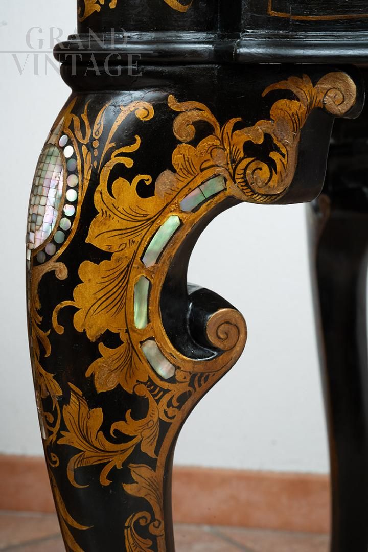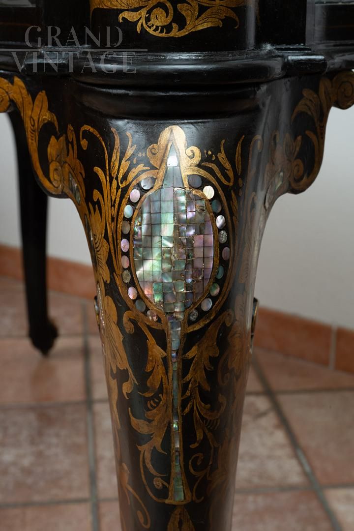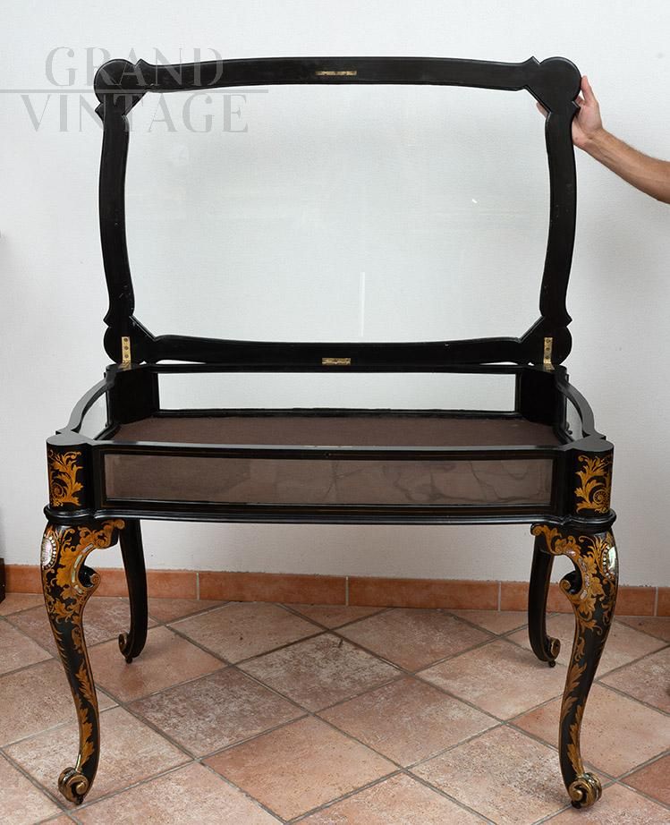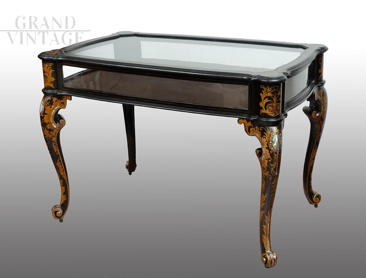 Tavolino a bacheca antico Napoleone III in legno ebanizzato con madreperla