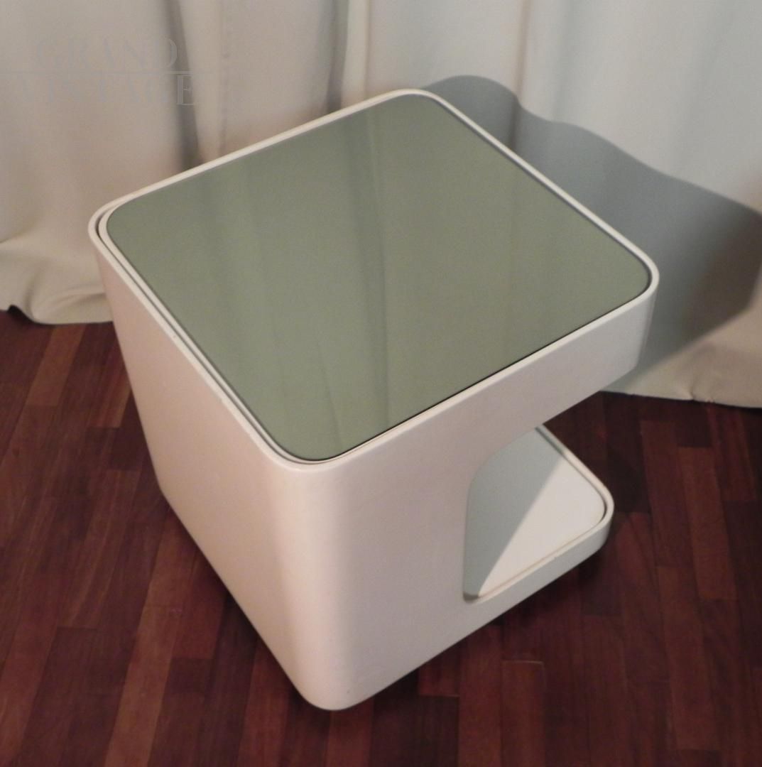 Tavolino con le rotelle o carrellino design di Marcello Siard per Collezione Longato con struttura originale in legno curvato e laccato bianco e piano in vetro, stile space age italiano anni '70.