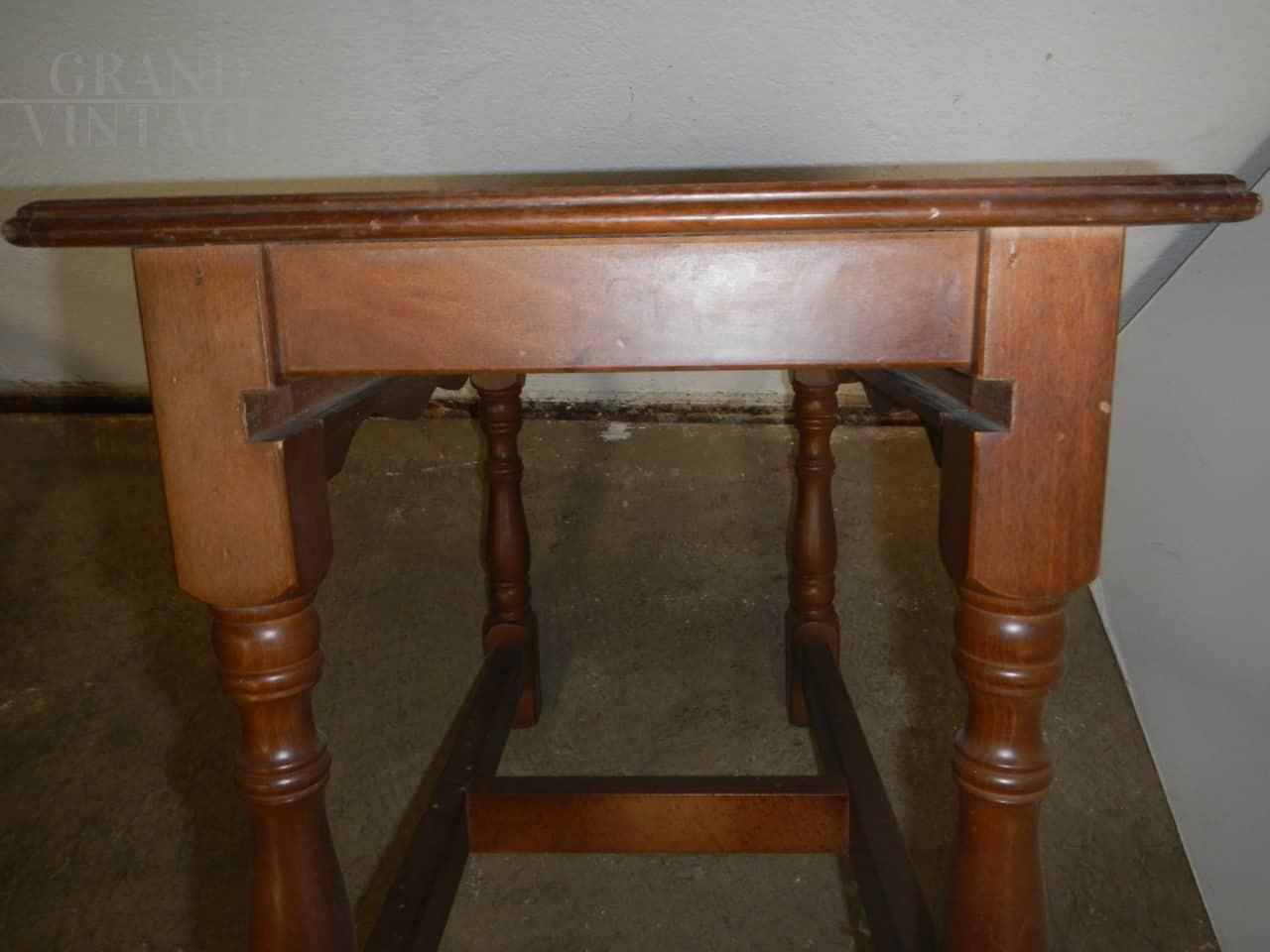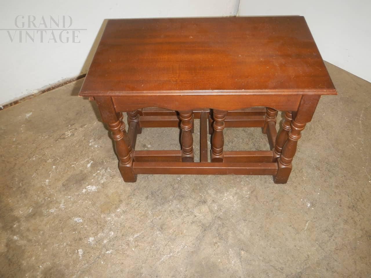 Set salotto vintage anni '80 composto da tavolino e due sgabelli a scomparsa in legno, con gambe tornite, in buone le condizioni.