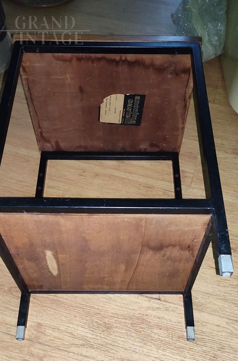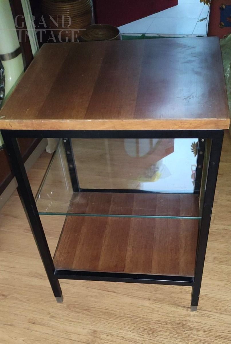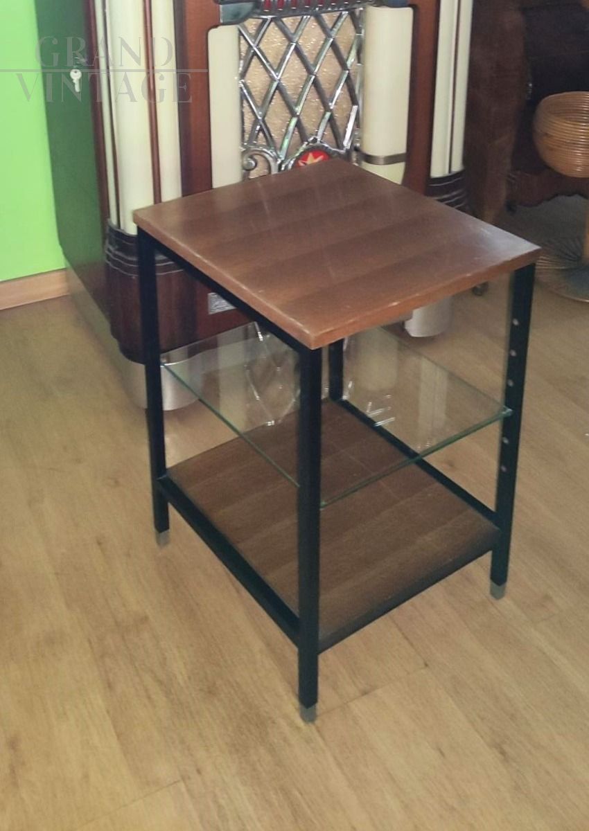 Tavolino mobiletto da tv o da telefono Anonima Castelli anni '60 in legno e vetro su struttura in metallo. Il mobiletto ha piccoli naturali segni del tempo, e presenta il marchio sotto il piano.