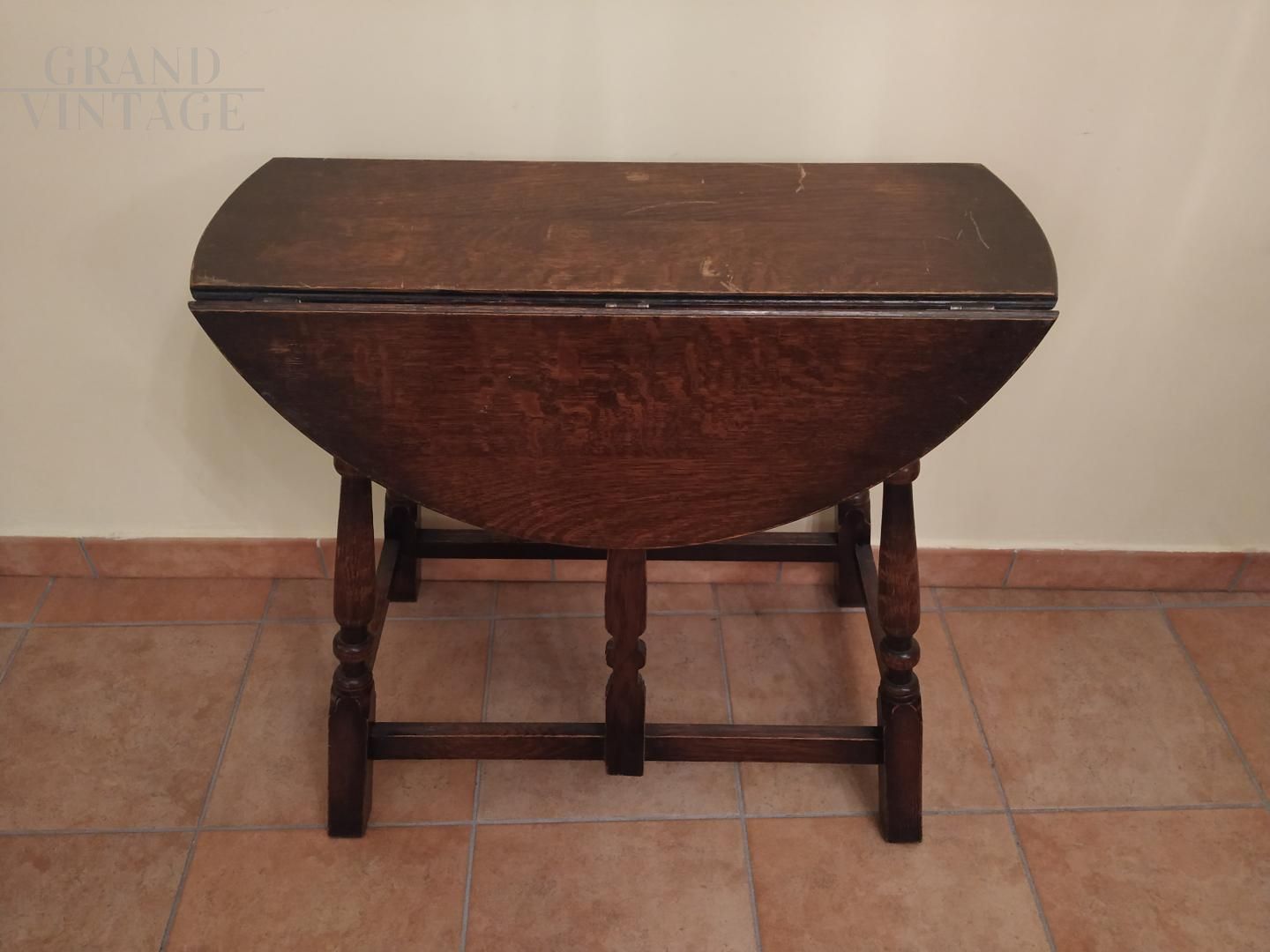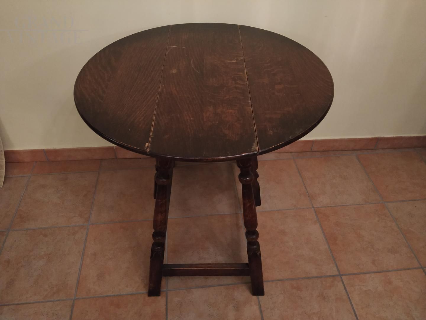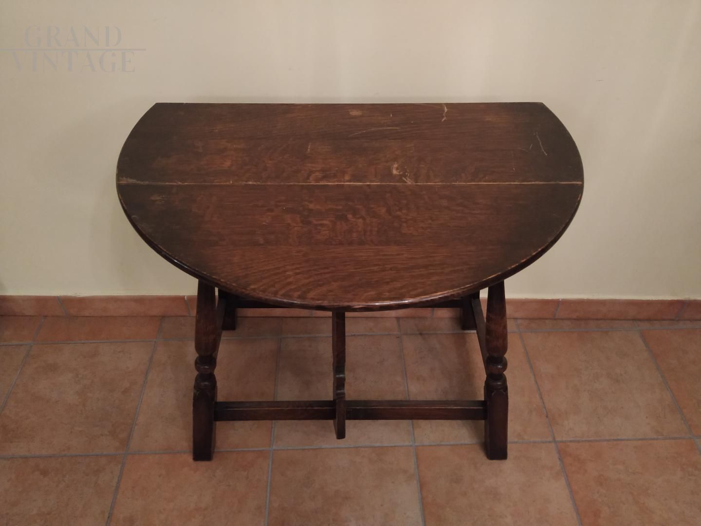 Piccolo tavolo a bandelle antico, fatto completamente in legno massello di rovere. Provenienza Nord Inghilterra, epoca Edoardo VII. Tavolino molto versatile per multiuso quotidiano. All'occorrenza può diventare un piccolo tavolo tondo (da pranzo o da gioco), una consolle all'ingresso come vuota tasche, una consolle a mezza luna per tenere un punto luce.