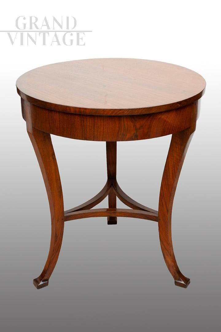 Tavolino antico Luigi XVI Napoletano in radica di noce appartenente alla seconda metà del XVIII secolo. Il piano di forma circolare poggia su una fascia sottopiano anche essa in radica. I tre piedi avente una forma a sciabola solo collegati da una crociera mistilinea di forma triangolare. Provenienza: Napoli XVIII secolo. Condizioni: Restaurato dai nostri maestri artigiani con metodo tradizionale gommalacca e alcool fatto a mano. Misure: Diametro 70cm. Altezza 80cm. Documento: Certificato di Autenticità. Assistenza: Siamo a vostra disposizione per ulteriori chiarimenti o particolari fotografici