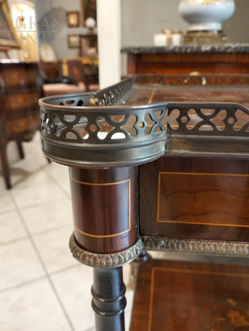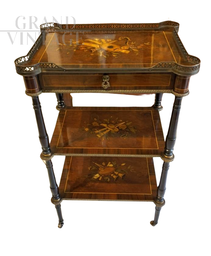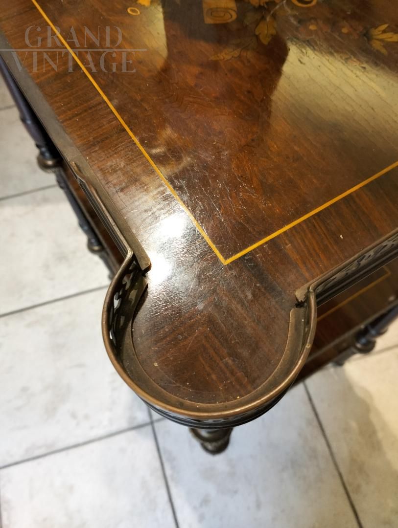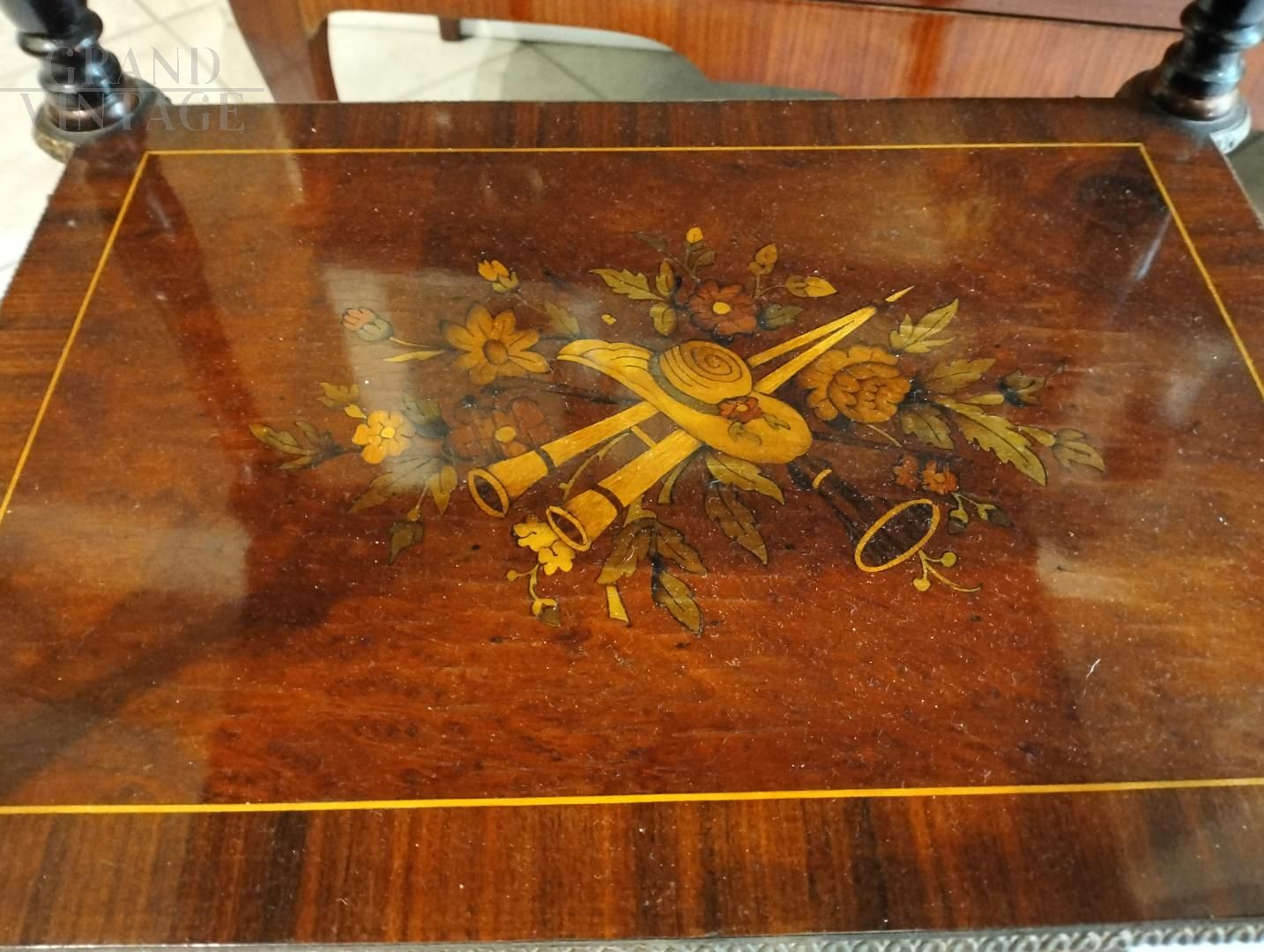 Bellissimo raffinato tavolino antico epoca Napoleone III seconda metà del secolo XIX. Il tavolino in noce è caratterizzato da linea neoclassica con raffinato decoro ad intarsio a tema musicale realizzato con legni diversi di essenze pregiate.