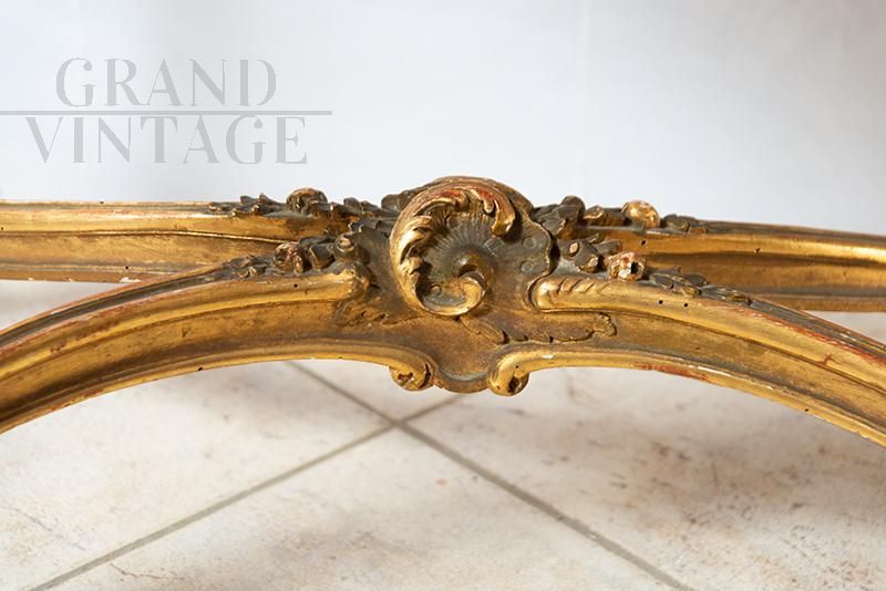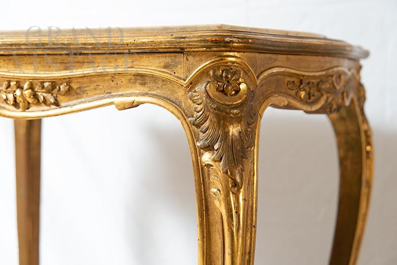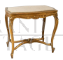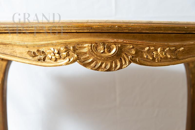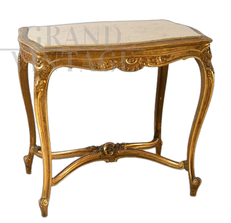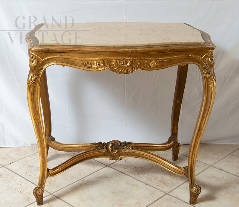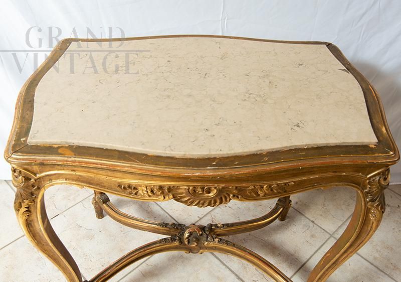 Tavolino antico Napoleone III in legno dorato e intagliato con piano in marmo