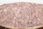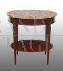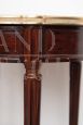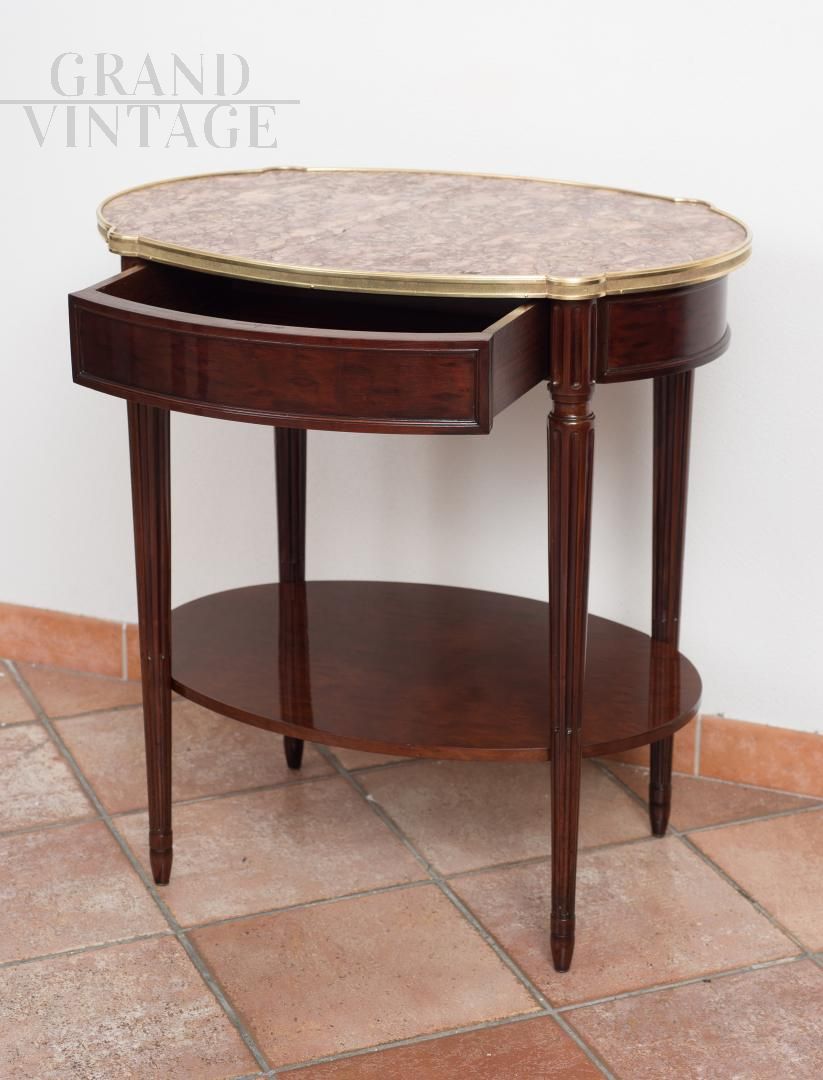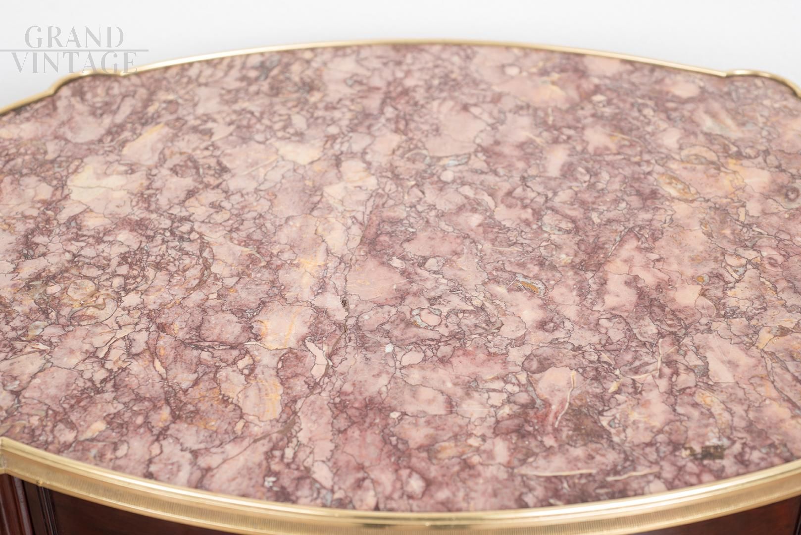 Tavolino antico Francese Napoleone III in massello di mogano con applicazioni in bronzo dorato. Il piano in marmo rosa è contornato da una guarnitura in bronzo ed è sostenuto da una fascia sottopiano con cassetto integrato. Quattro gambe scanalate sono raccordate da una mensola centrale, rendendolo molto stabile. Stampigliato sul cassetto Haentges Frères.