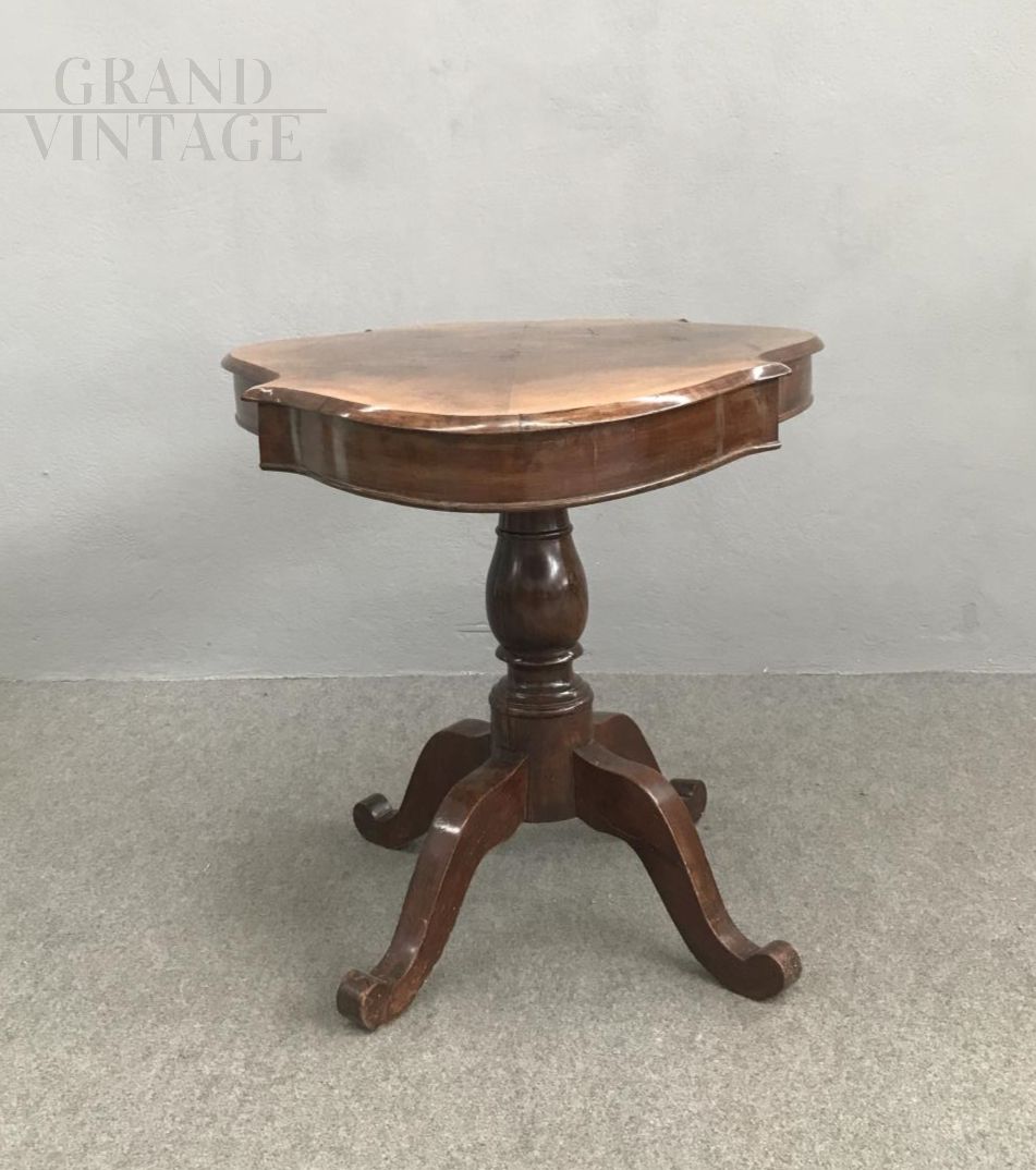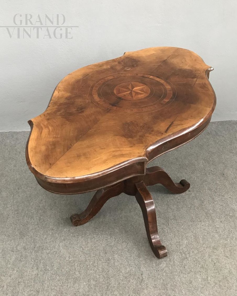 Tavolino antico ovale a biscotto in noce, gamba centrale tornita, piano in radica di noce e intarsio centrale, epoca '800.