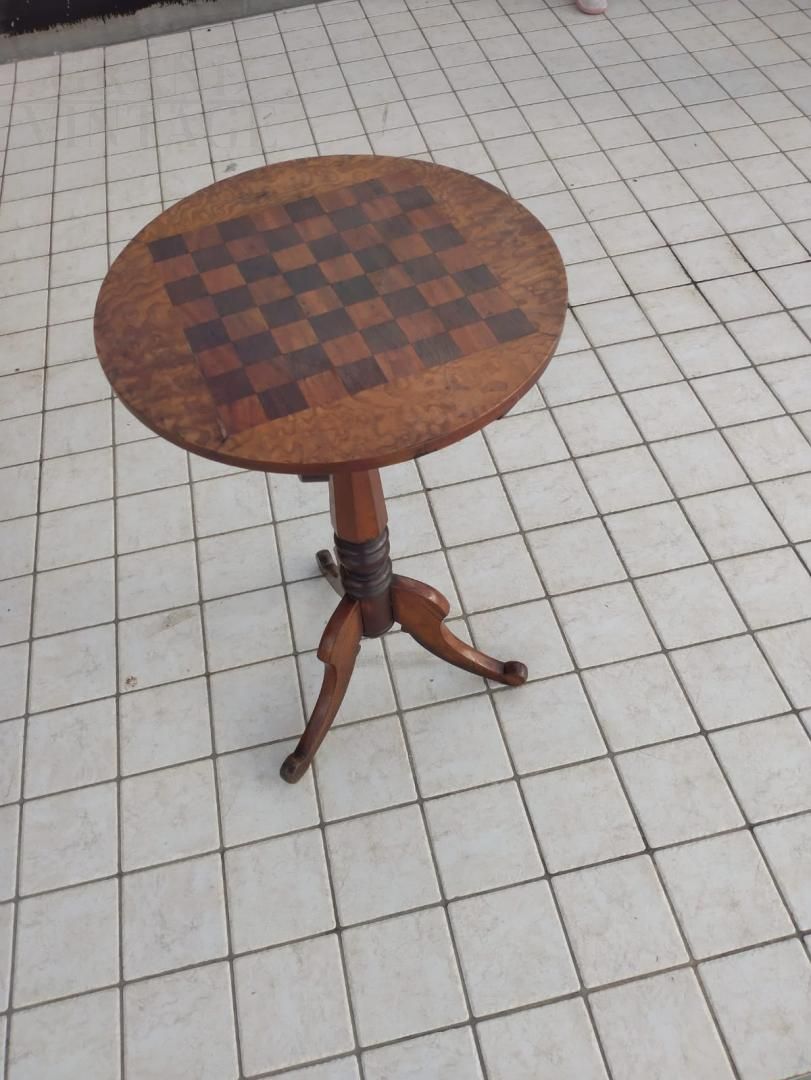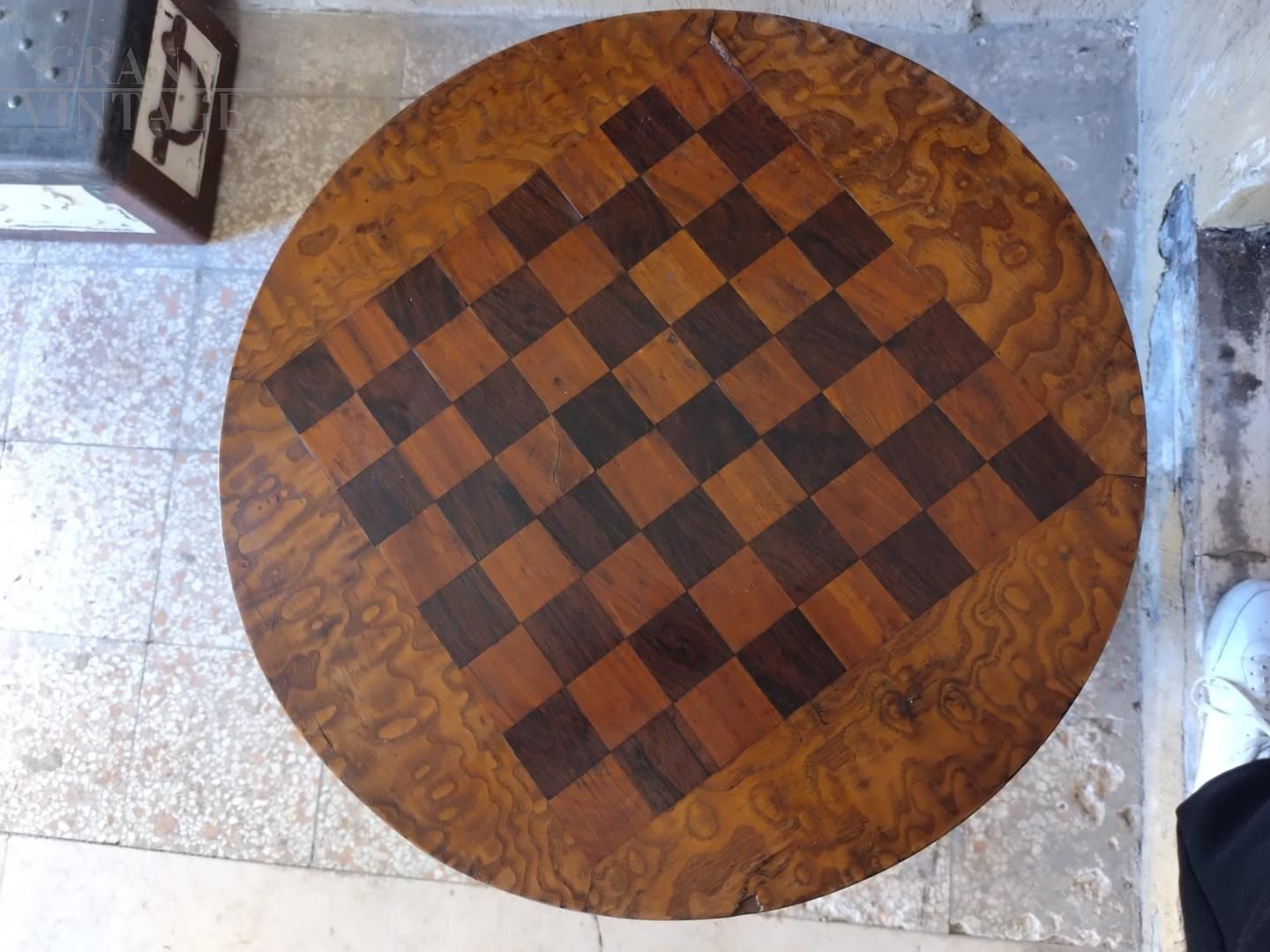 Tavolino antico rotondo a vela con scacchiera intarsiata, XIX secolo