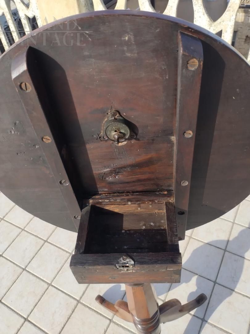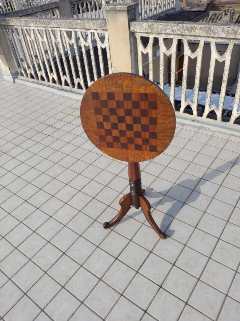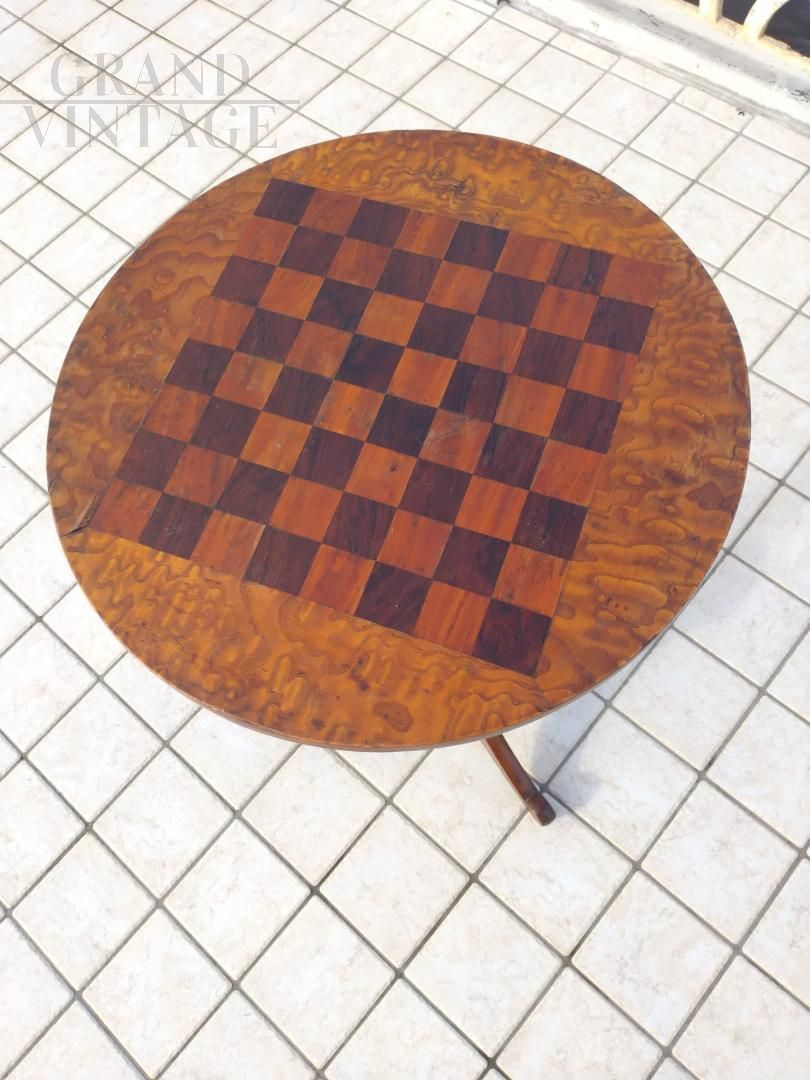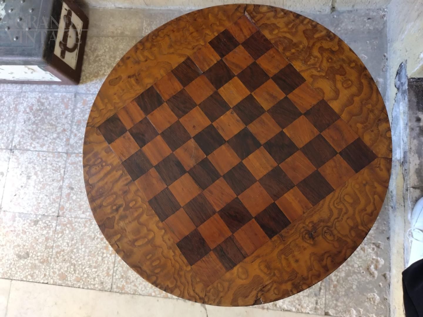 Bellissimo tavolino da gioco rotondo antico a vela con piano intarsiato a scacchiera, realizzato nella seconda metà del XIX secolo in massello di noce e bella radica di betulla sul piano. Il tavolino si presenta in ottime condizioni.