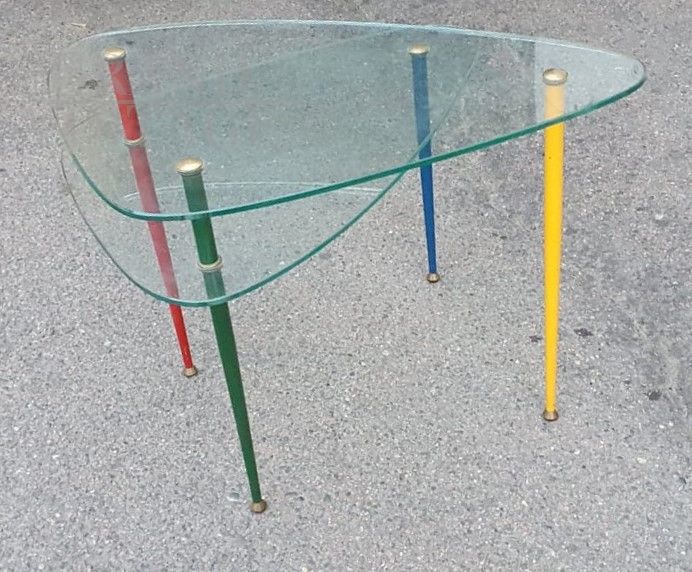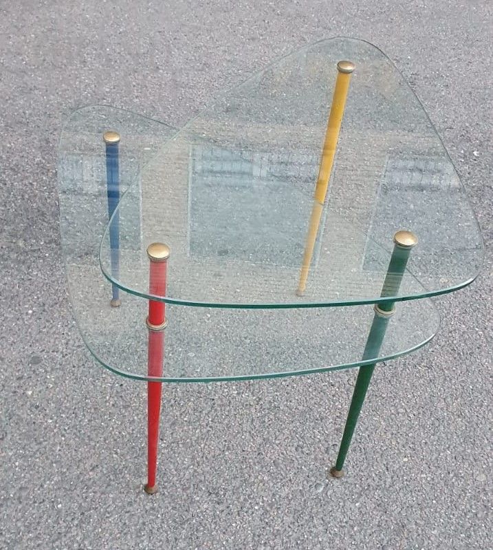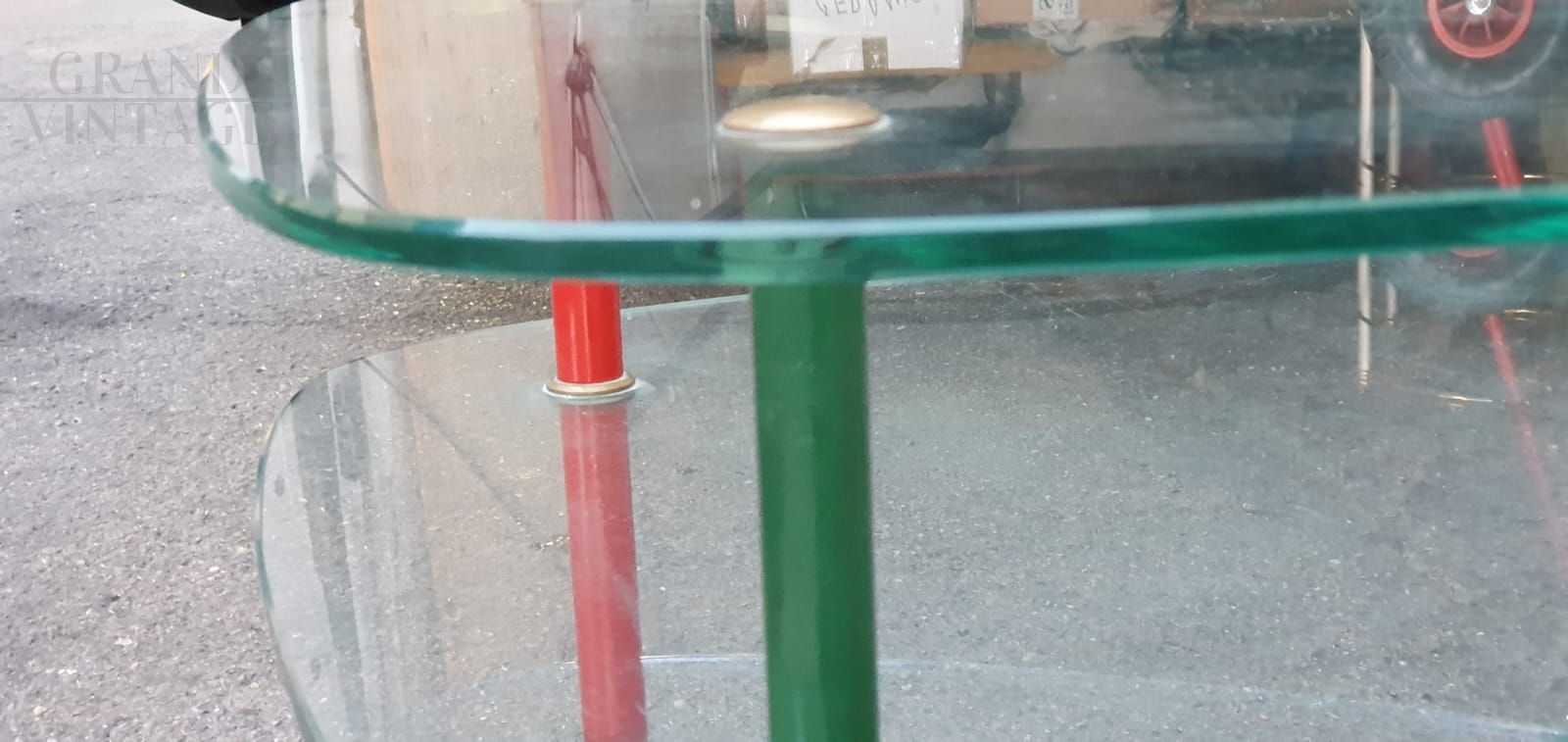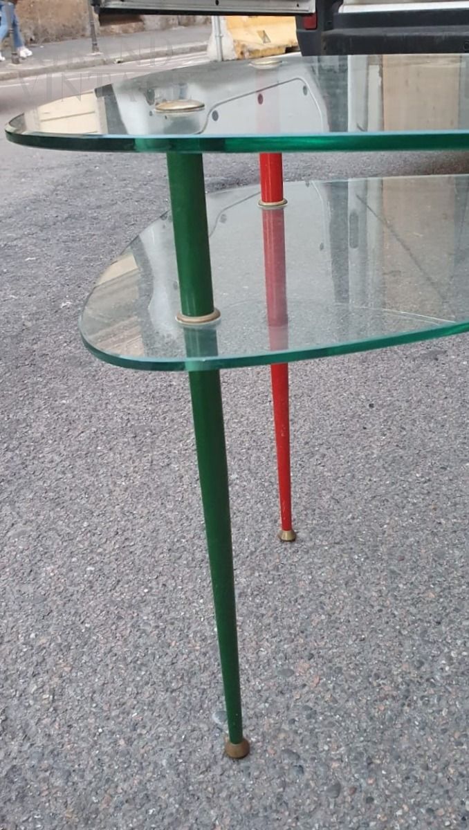 Bellissimo tavolino design Arlecchino di Edoardo Paoli per Vitrex con due piani in vetro temperato a forma di rene e quattro gambe in metallo verniciato in diversi colori: rosso, giallo, verde e blu, con dettagli in ottone. Prodotto negli anni '60, il tavolino è in ottime condizioni, i piani in vetro presentano diversi segni del tempo come da foto. E' presente la firma Vitrex, a garanzia dell'autenticità.