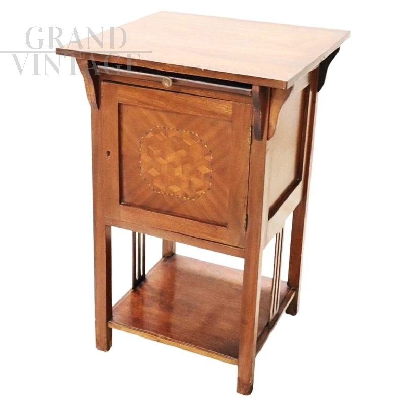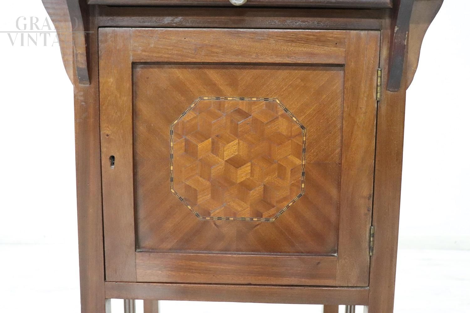 Delizioso piccolo tavolino Art Nouveau in noce degli inizi del XX secolo, caratterizzato da un delizioso decoro di gusto geometrico sul fronte e un piano estraibile da appoggio. Molto semplice e lineare, di facile collocazione in qualsiasi ambiente della casa. Ottime condizioni di conservazione, ottimo prezzo trattabile.