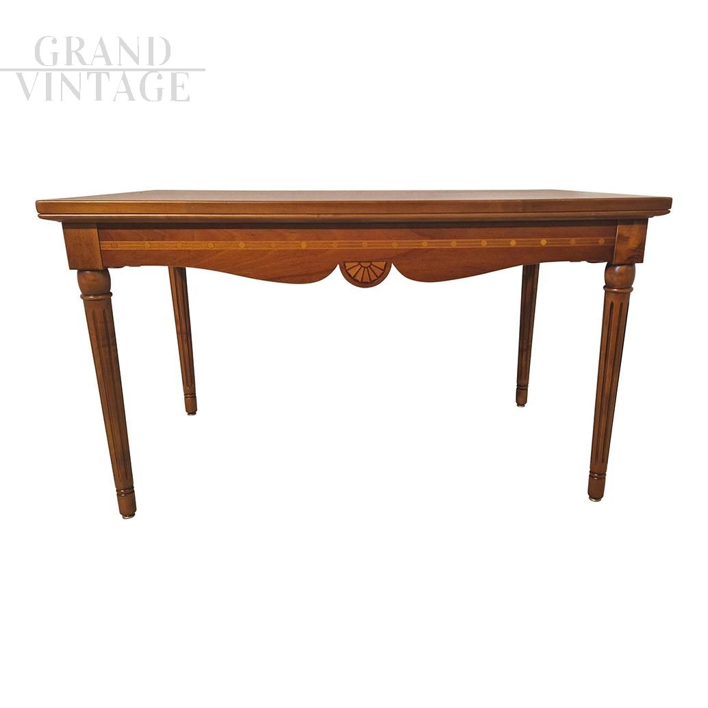 Tavolino basso da salotto in stile lombardo antico realizzato nella seconda metà del XX secolo in noce con intarsi sulla fascia sottopiano, quattro gambe scanalate.