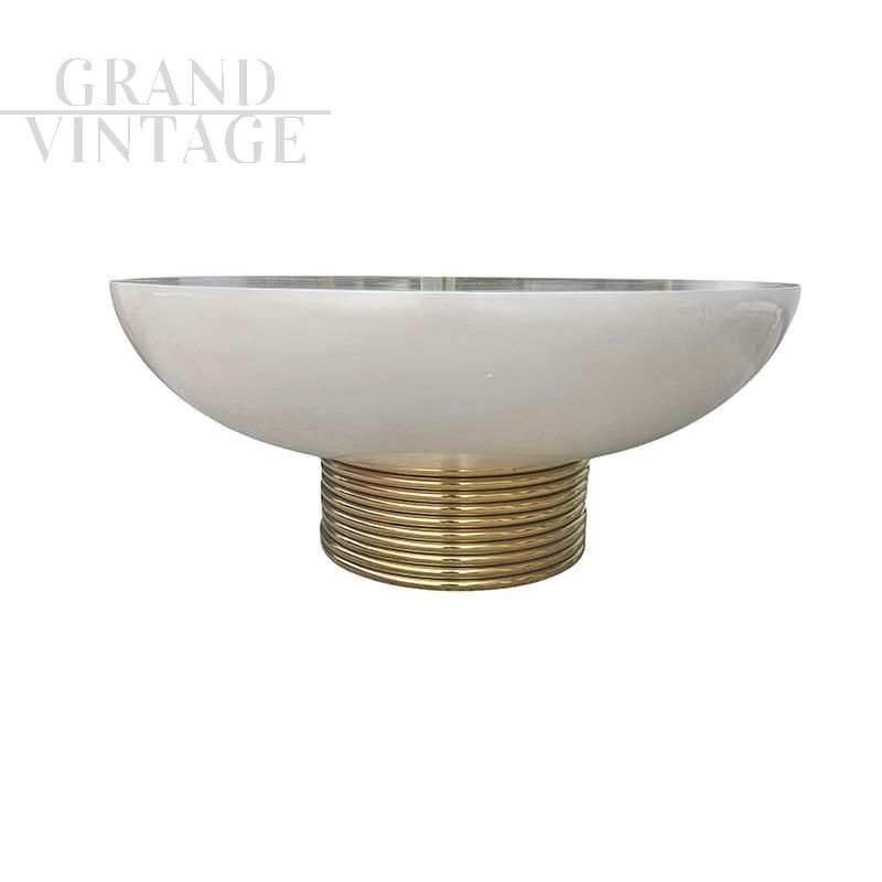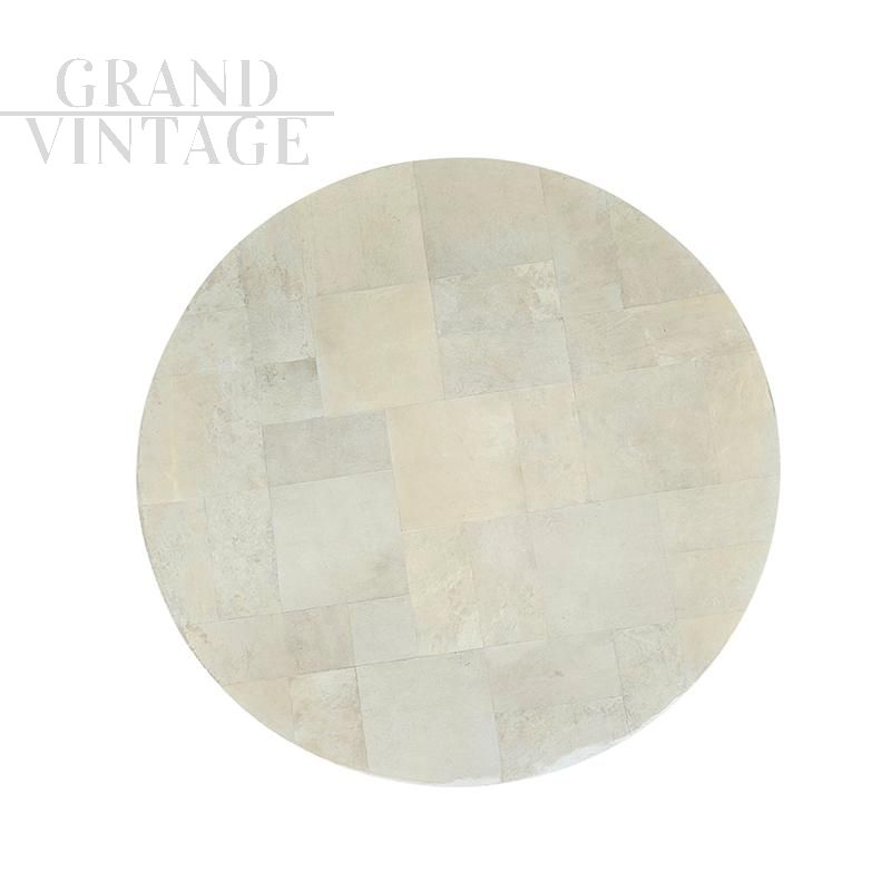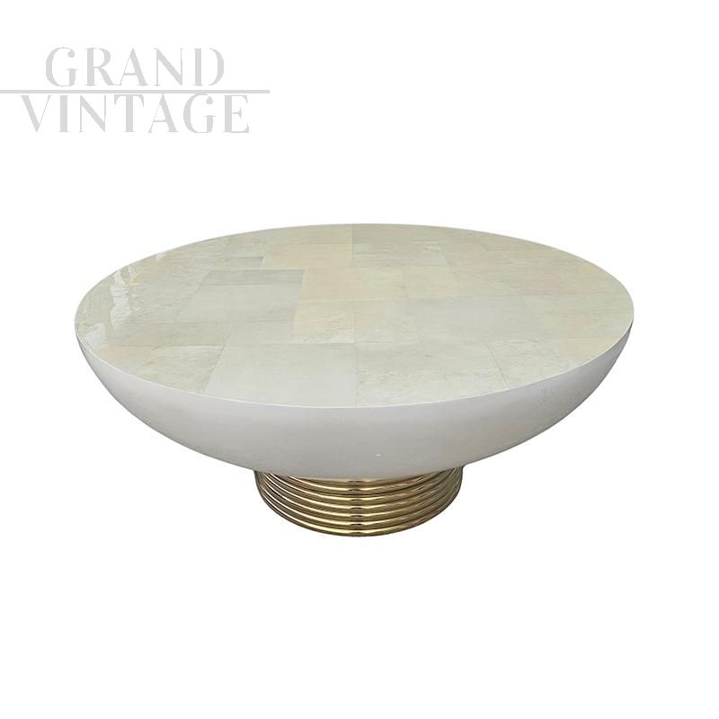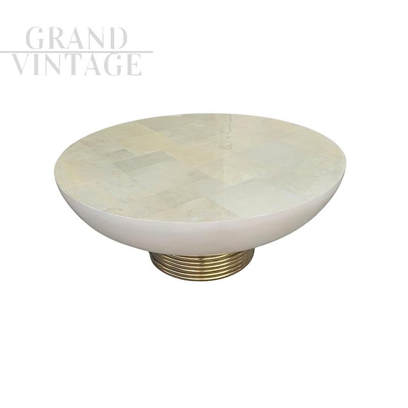 Elegante tavolino da divano semplice e lineare ma molto lussuoso, sia per il materiale utilizzato per rivestire il legno, la pelle di capra, sia per l'ottone per la realizzazione della gamba. Il tavolo ha una forma rotonda, nella parte superiore del piano è stato rivestito in pelle di capra. Il lato del piano è arrotondato, in modo da sembrare un guscio d'uovo tagliato a metà. Il piano poggia su una gamba rotonda, realizzata con tubi di ottone curvati e poi saldati, posti uno sopra l'altro. I tubi di ottone sono otto, posizionati uno sopra l'altro, e snelliscono notevolmente il design del tavolo. La pelle di capra è in ottime condizioni ed è disposta a quadretti, come si può vedere dalle foto.