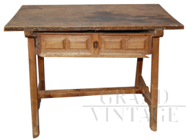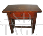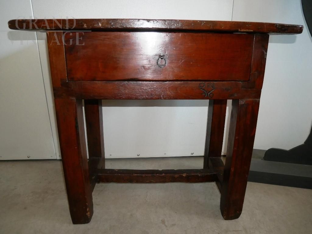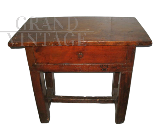 Tavolino basso rustico antico in noce massello con cassetto, costruito con elementi antichi alla fine del XIX secolo. Patina scura, buono stato generale, presenta vari segni del tempo alla vernice e al legno, non restaurato.