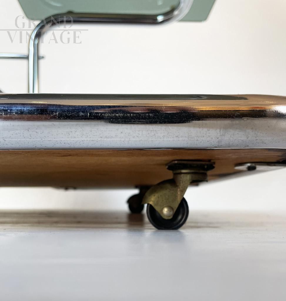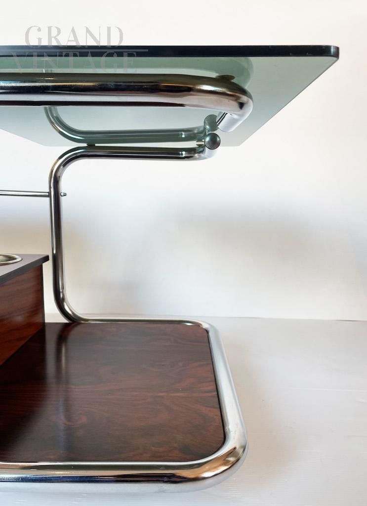 Tavolino carrellino vintage in vetro fumé, acciaio e legno con porta bottiglie