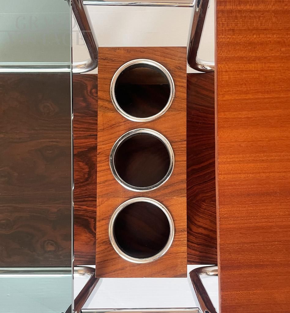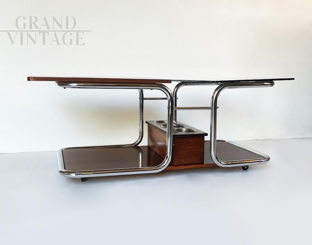 Particolare tavolino coffee table da salotto, vintage anni '70, in legno di teak, con caratteristica asimmetrica di un piano in vetro fumé e uno in legno, leggermente più grande. Il perimetro è caratterizzato da dettagli in acciaio cromato. Tra i due piani si trovano tre pratici portabottiglie in legno con ghiere cromate. Il tavolino è completo di rotelle.
