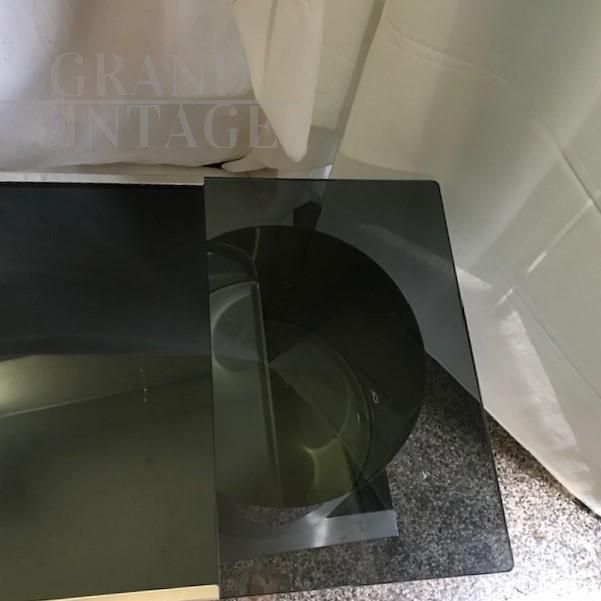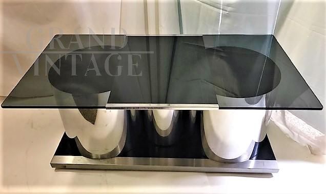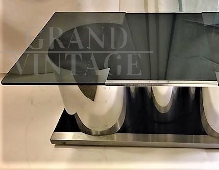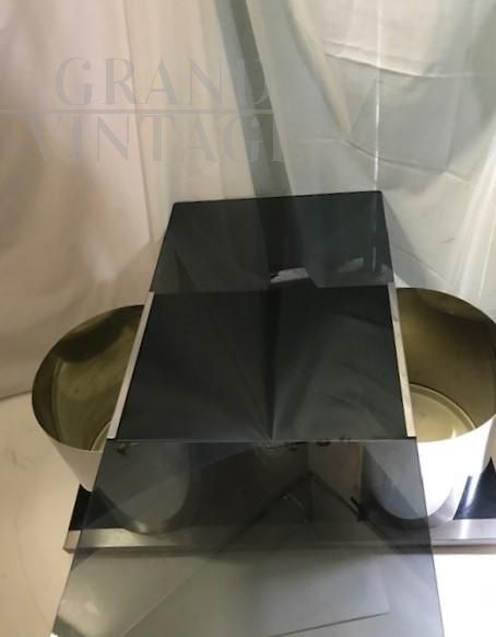 Raro tavolino cocktail bar prodotto da Domustil Italia negli anni 70anni '70. La struttura è composta da due cilindri in lastre d'acciaio curvato e lucidato, poggianti su una base in legno laccato nero, e reggono un piano in vetro fumè di buono spessore, che ruota su se stesso a scoprire i due vani portabottiglie e bicchieri, attrezzati con vassoi in plastica.