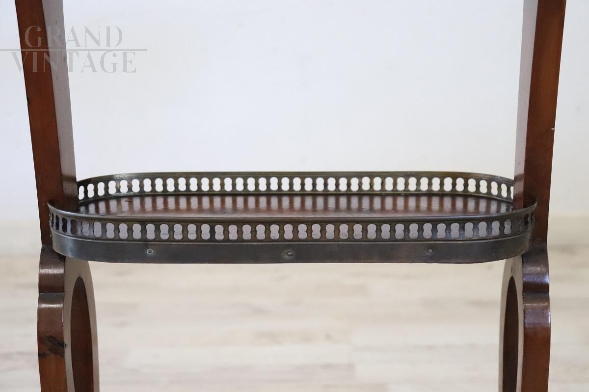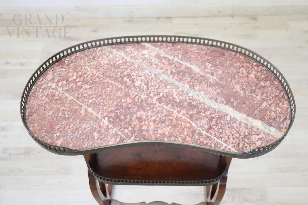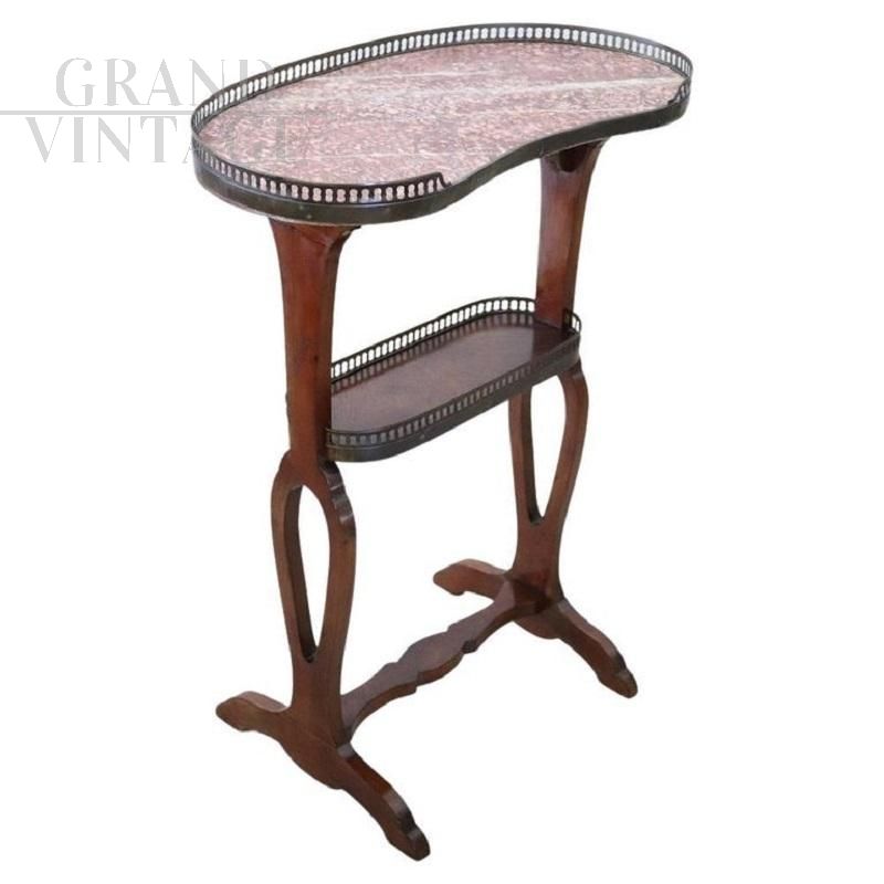 Splendido e raffinato tavolino da appoggio proveniente dall'Italia della fine del XIX secolo, periodo Napoleone III. Realizzato in legno di noce, il piano superiore in elegante marmo rosso ha una particolare forma chiamata "a fagiolo". Le sue linee sono semplici ma raffinate, ha un secondo piccolo piano nella parte inferiore. Le cornici in bronzo conferiscono un particolare accento decorativo. dal punto di vista funzionale, le sue dimensioni ridotte permettono di integrarlo facilmente anche in spazi ridotti. Prezzo trattabile.