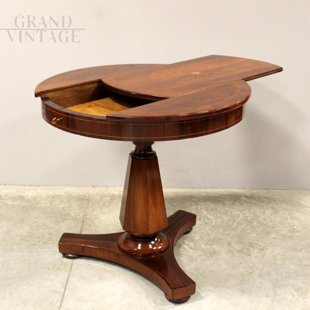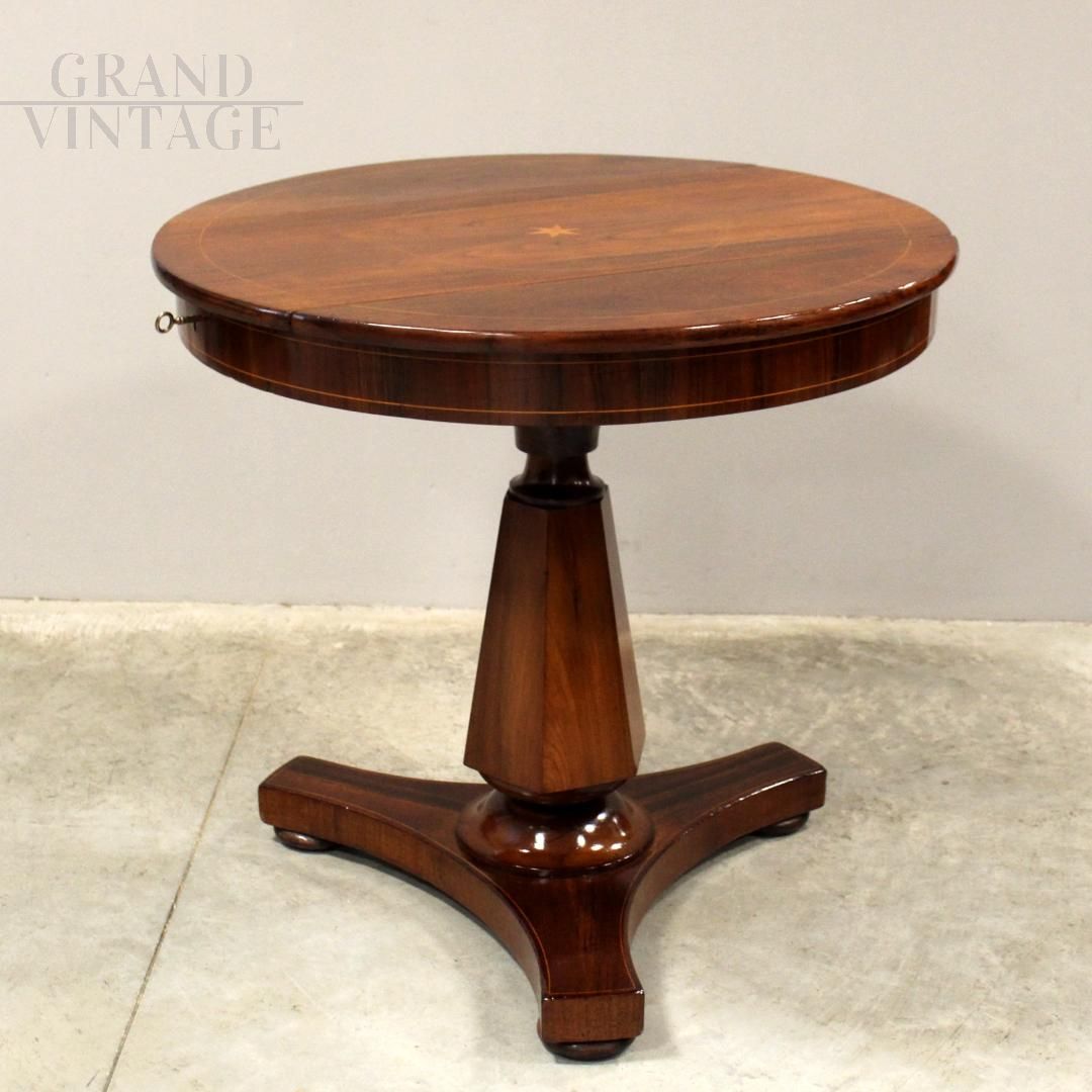 Tavolino da appoggio antico con piano rotondo e gamba centrale, di epoca Carlo X, realizzato in noce con intarsi e filettature in legni pregiati, Italia - Lombardia della prima metà dell'800, restaurato.