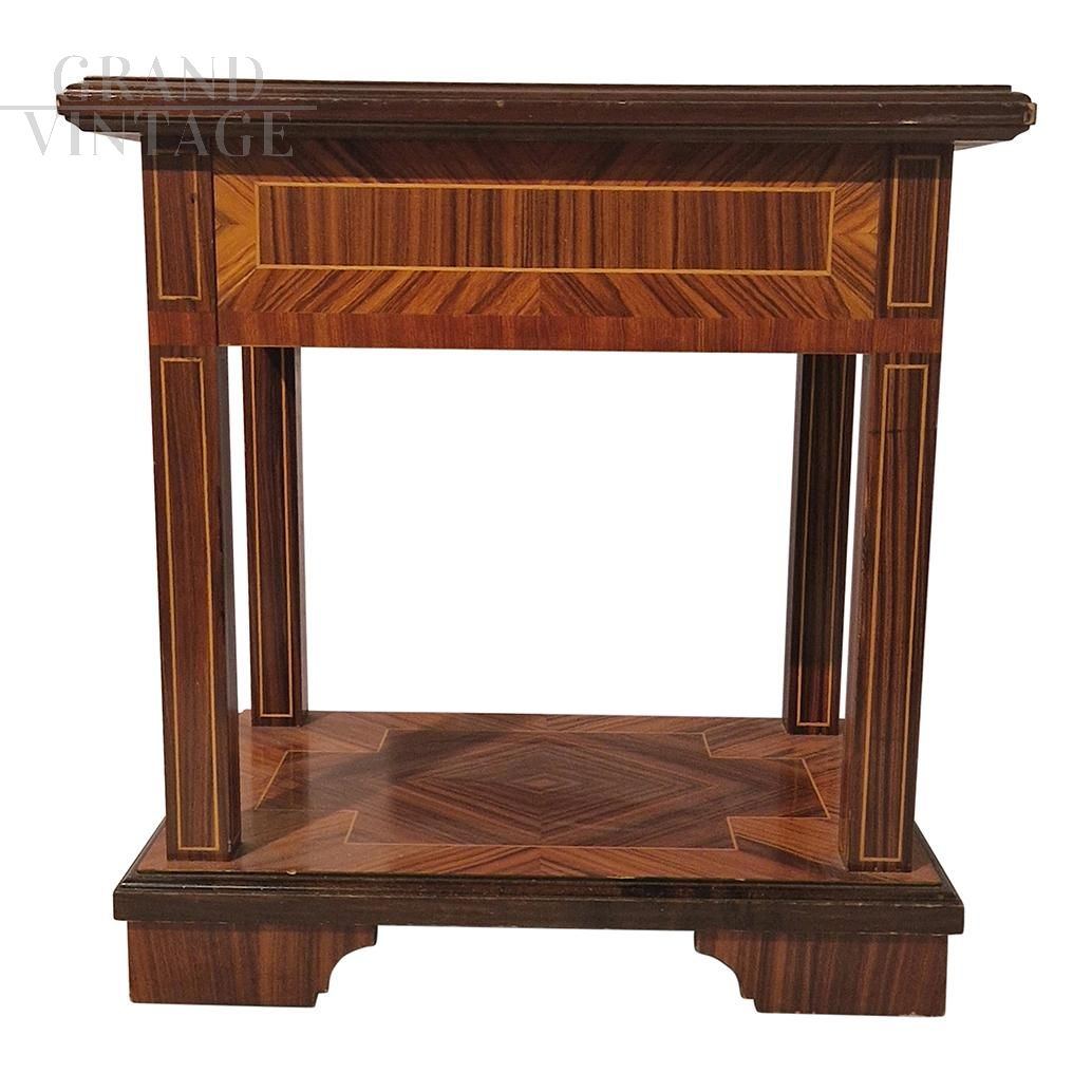 Antico tavolino da salotto o da appoggio o comodino in stile lombardo antico, realizzato in noce con filettatura in acero e intarsi geometrici in legni di noce, bois de rose e legno ebanizzato.