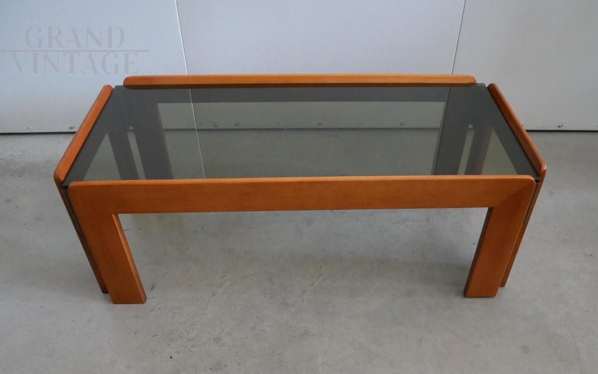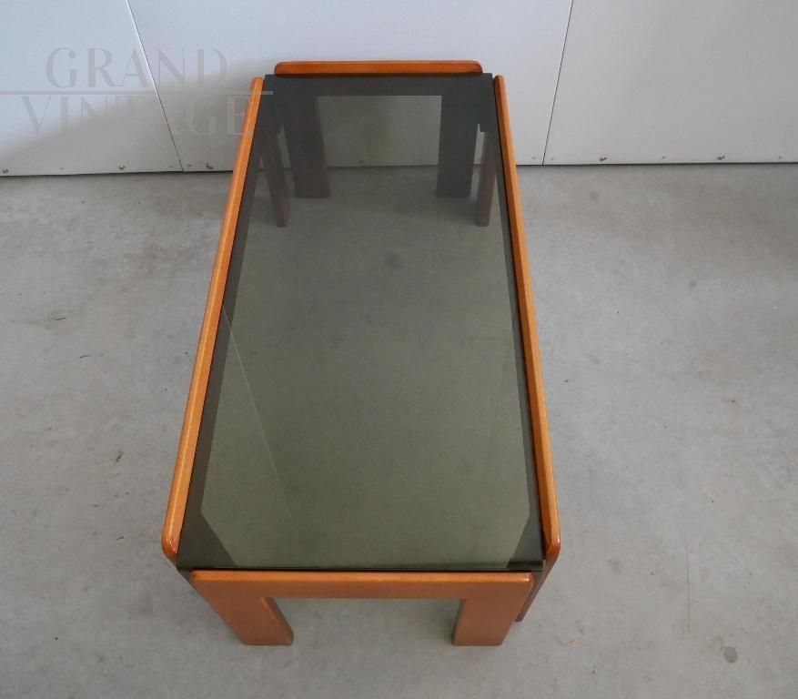 Tavolino da salotto design di Afra e Tobia Scarpa per Cassina con struttura rettangolare in legno e piano in vetro fumé, modernariato italiano anni '70. Si tratta di un'attribuzione, non presenta marchi ne' etichette. Ottime condizioni generali.