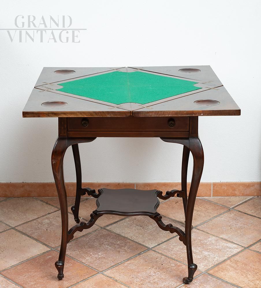Tavolino da gioco Inglese antico in legno di mogano con innesti di intarsio in acero appartenente alla seconda metà del XIX secolo. Il piano è composto da quattro spicchi evidenziati dagli intarsi a racemi, ruotandoli formano un quadrato di gioco con centro rotondo in panno verde. La fascia sottopiano include un cassetto estraibile tramite pomelli in bronzo. I piedi a cabriolet sono raccordati da una mensola centrale e terminano con delle rotelle in porcellana. Provenienza: Inghilterra XIX secolo.