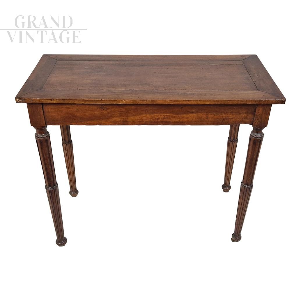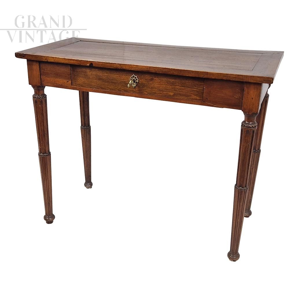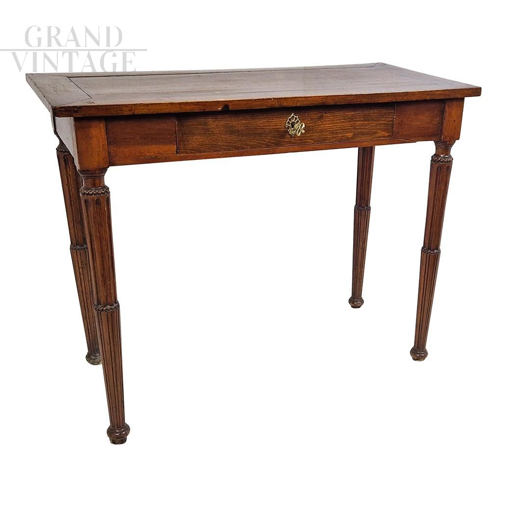Tavolino da gioco o da appoggio antico di fine '800 in legno pregiato, con gambe alte e scanalate di forma troncopiramidale e un cassetto alla fascia.