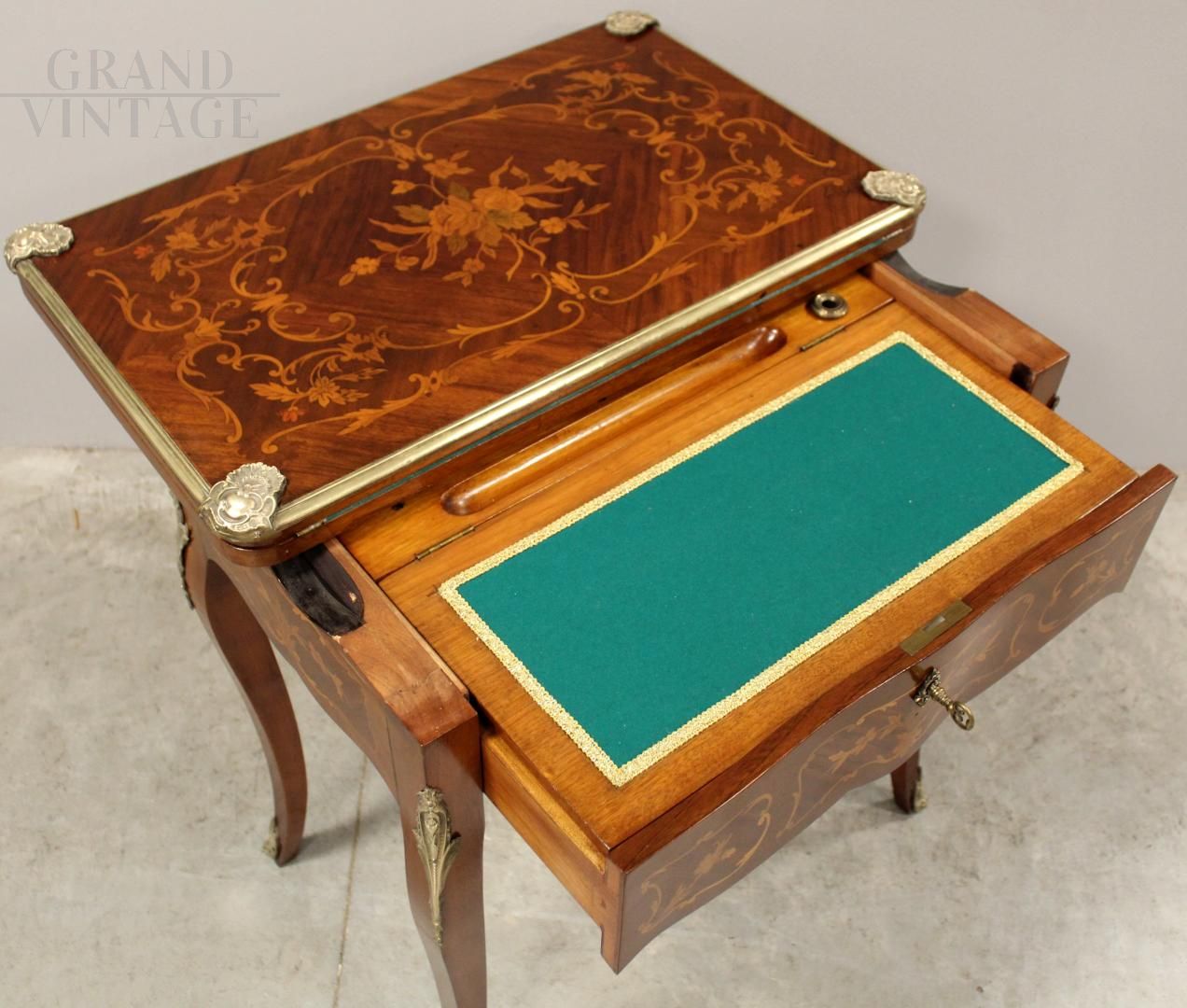 Tavolino Napoleone III In bois de rose a marqueterie, elegantemente intarsiato e filettato in vari legni pregiati, completo di bronzi dorati originali - notare che può avere diverse funzioni come tavolino da gioco, scrittoio o toilette. Epoca fine '800 - Napoleone III, restaurato.