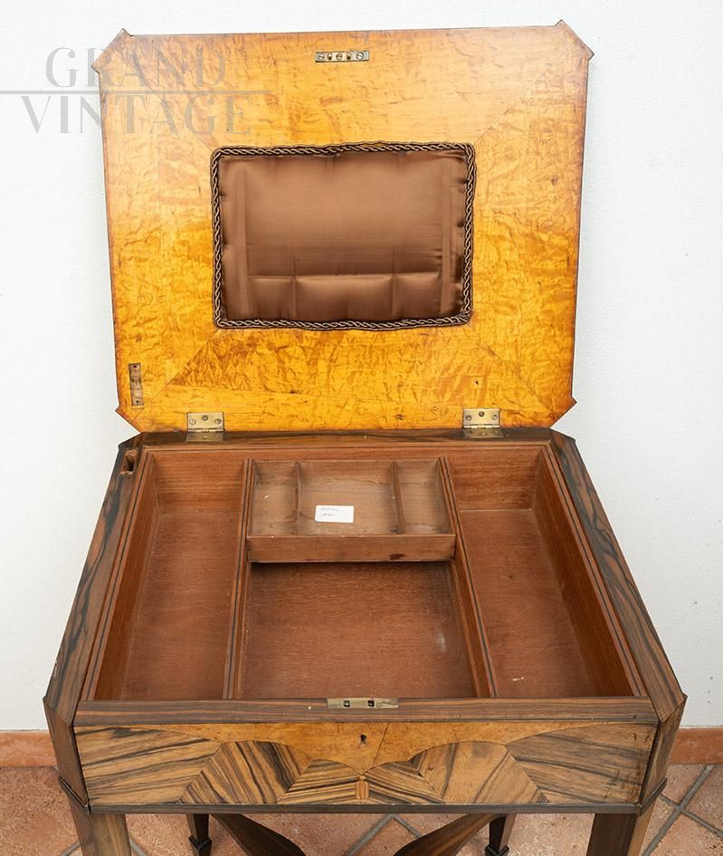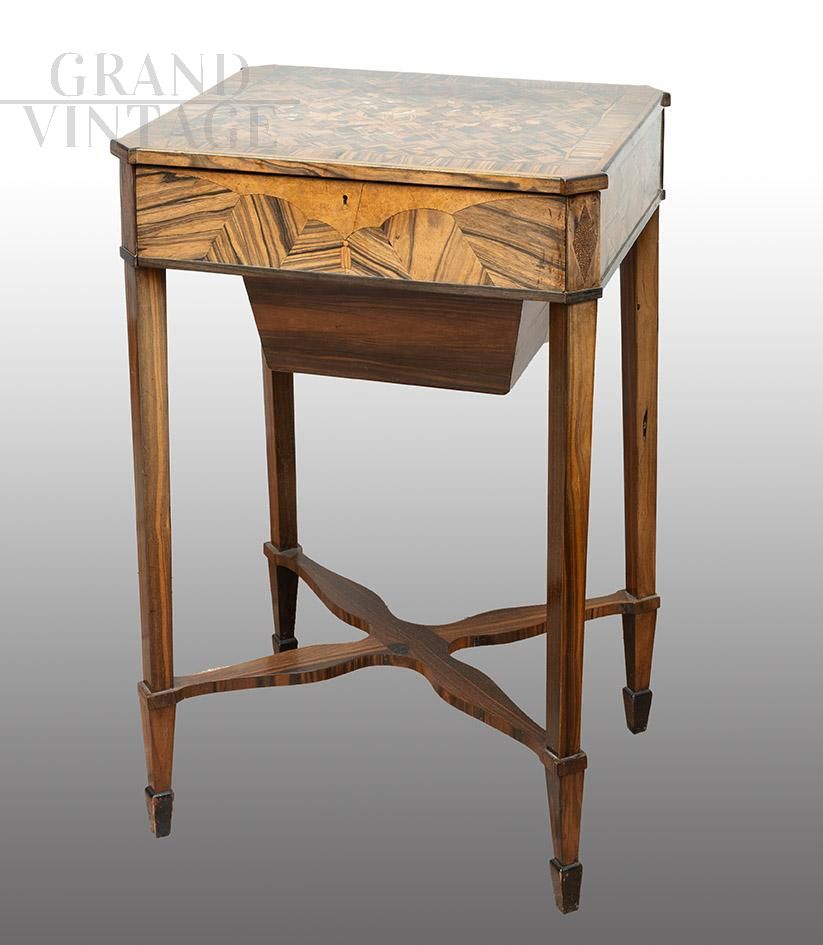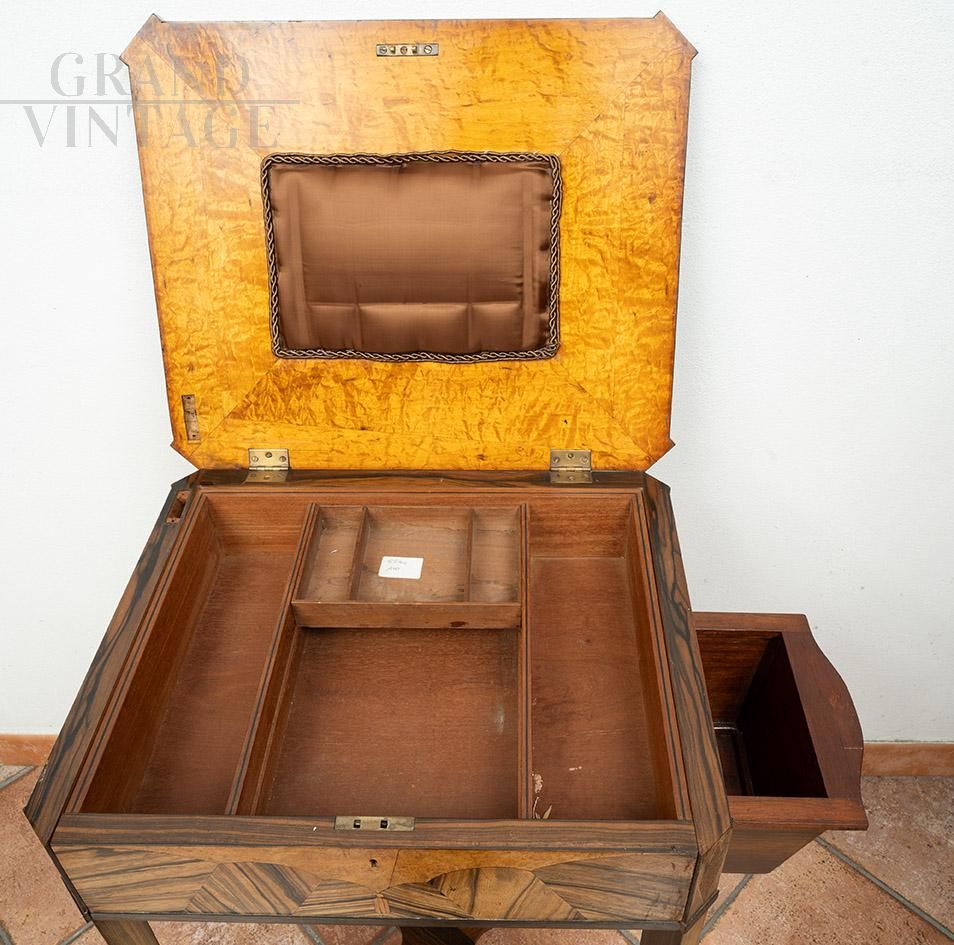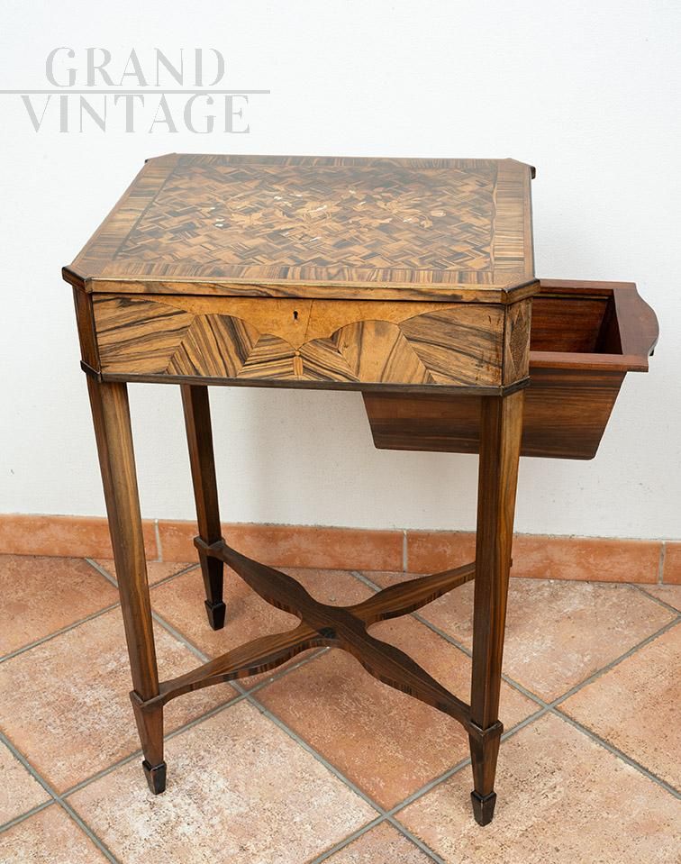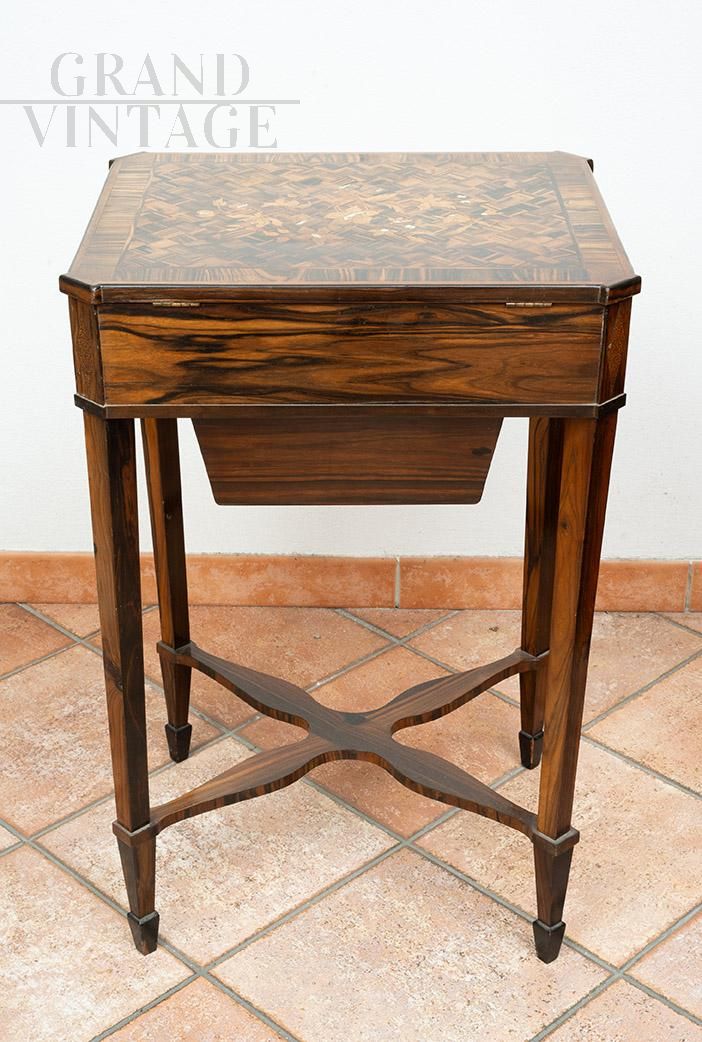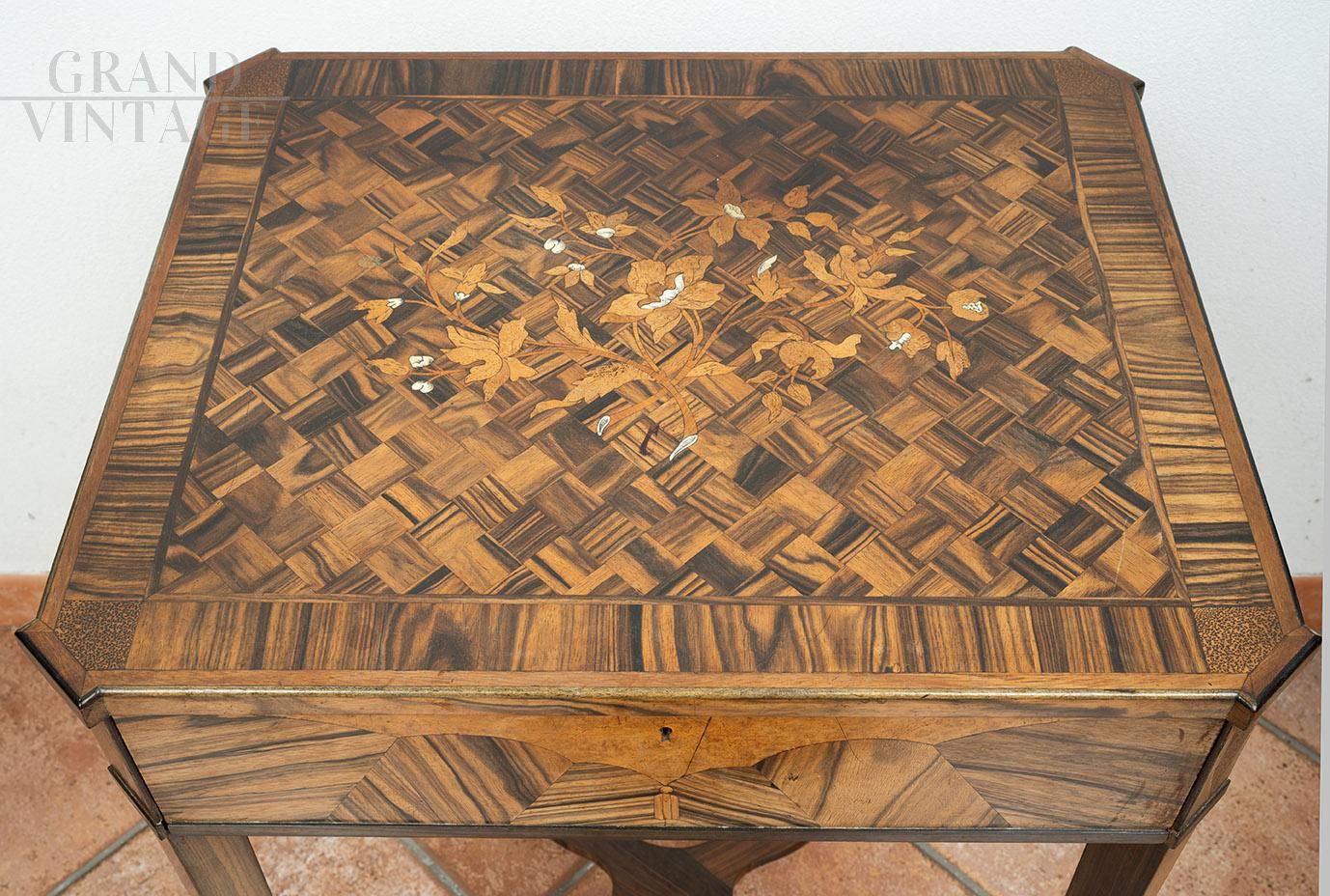 Tavolino da lavoro antico Napoleone III intarsiato in legni esotici pregiati