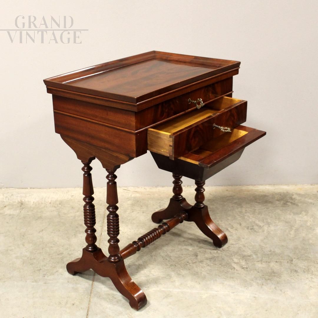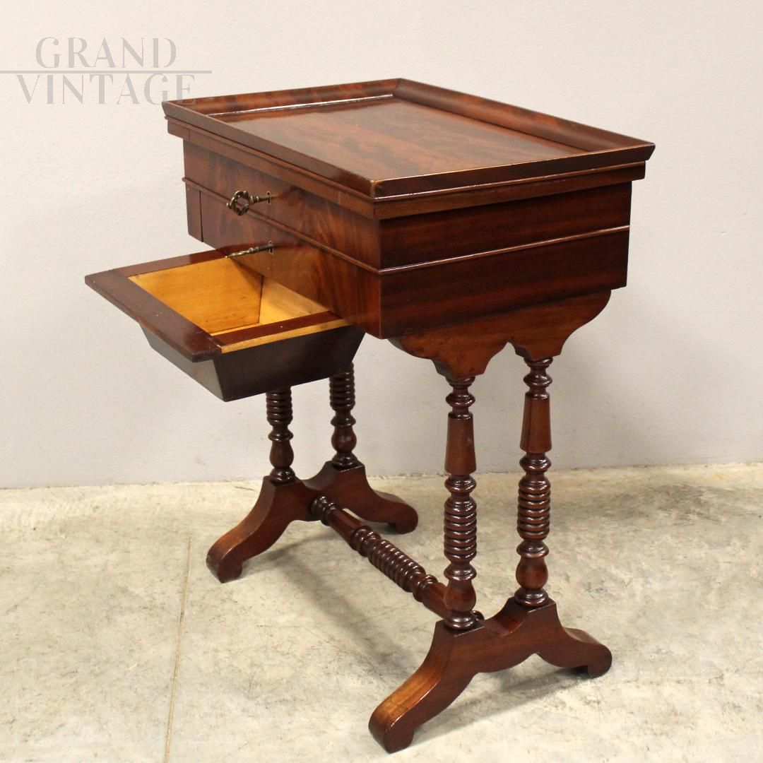 Tavolino da lavoro antico in legno scuro di mogano e piuma di mogano, con specchio e gambe tornite a rocchetto, epoca: seconda metà dell'800, restaurato.