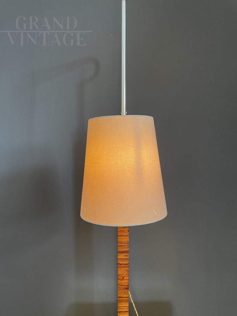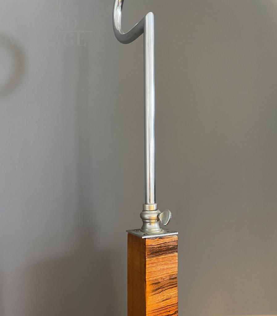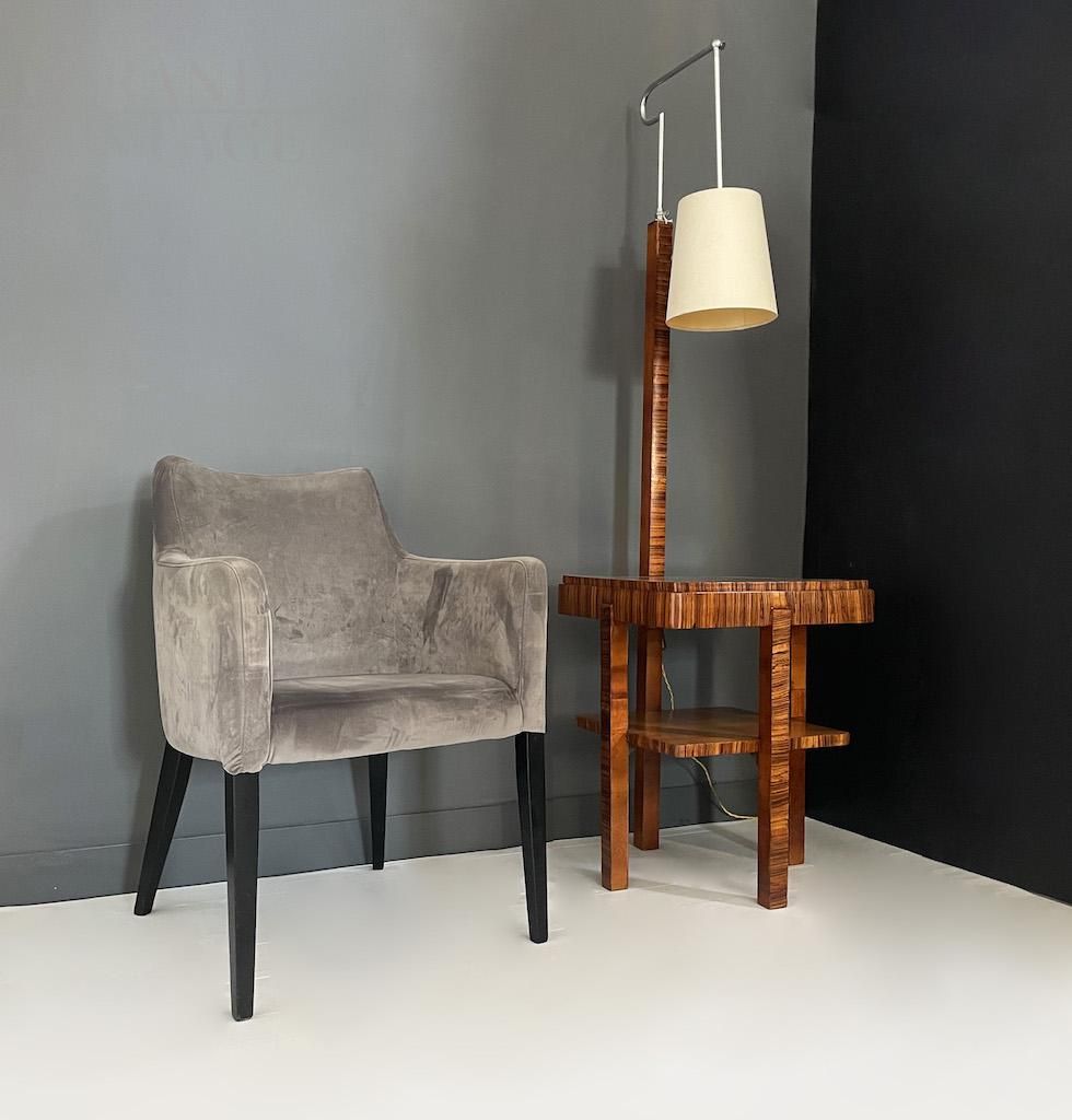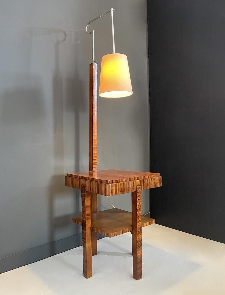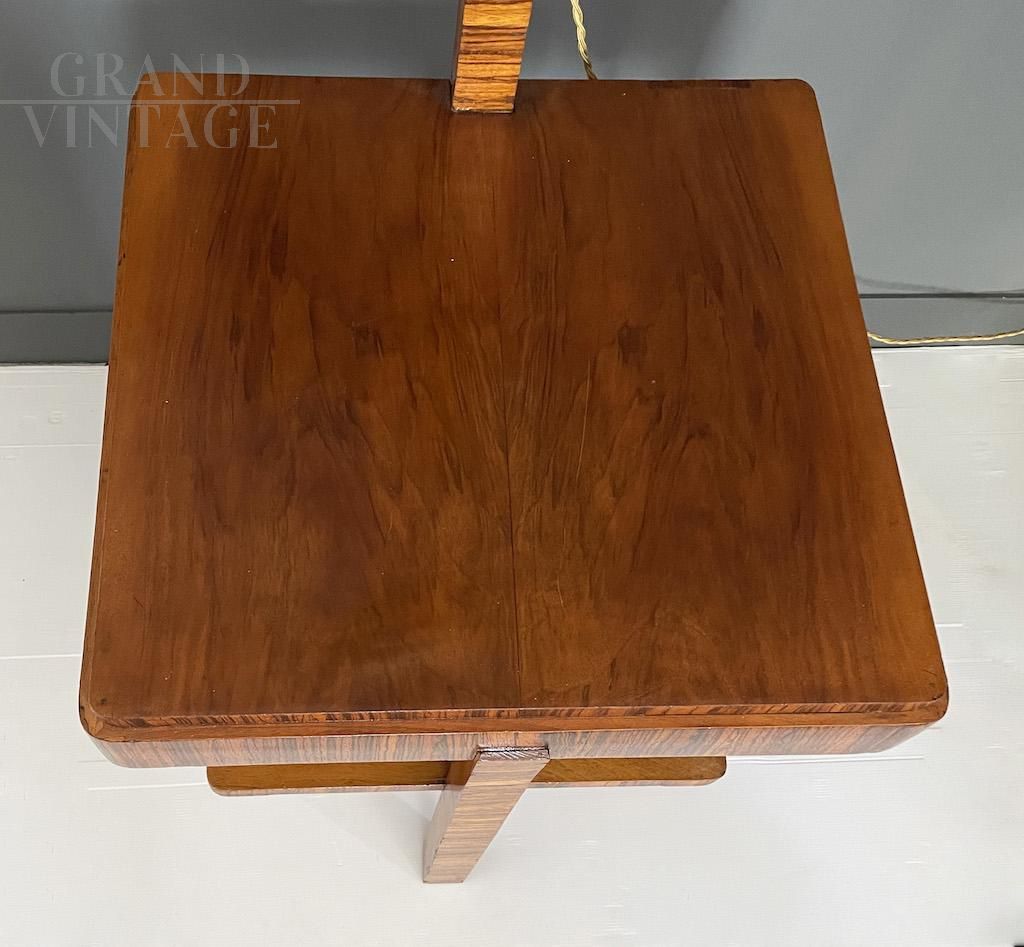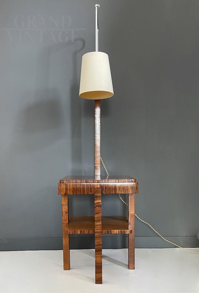Particolare tavolino da lettura con lampada Art Déco originale anni '30 con struttura interamente in mogano biondo, paralume in tessuto color crema e lume orientabile, Italia anni '30.