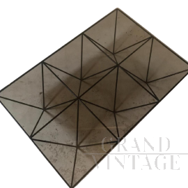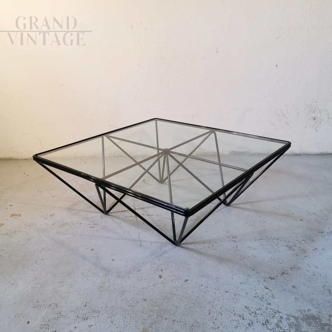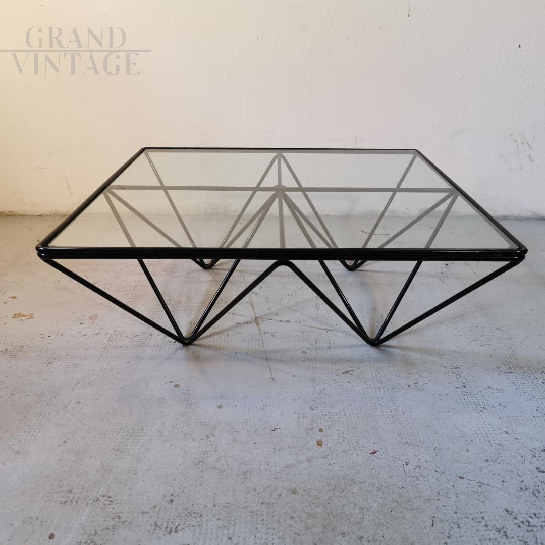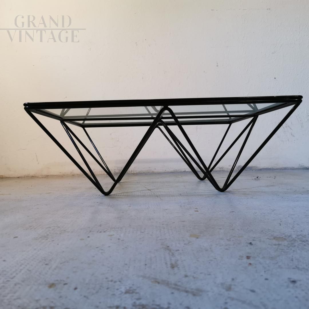 Tavolino basso di Paolo Piva modello Alanda originale, con tipica struttura in acciaio a piramidi rovesciate color nero lucido, piano in vetro originale, in ottime condizioni.
