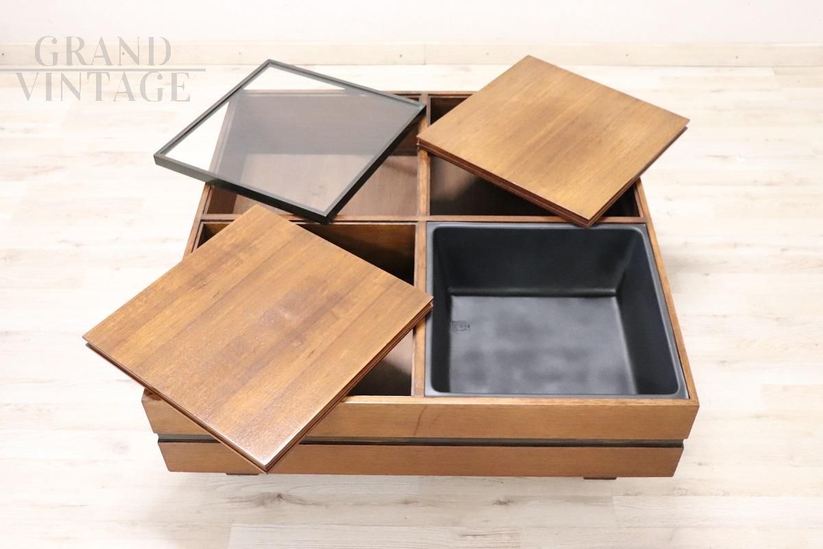 Questo tavolino di Carlo Hauner è un vero capolavoro di design che incarna perfettamente l'eleganza e la funzionalità tipiche degli anni '60. Il piano è caratterizzato da un aspetto personalizzabile, i tre coperchi di cui uno a vetro sono infatti intercambiabili a piacere. Un vano aperto e rivestito in plastica era stato progettato per contenere delle fiante da appartamento. I tre coperchi nascondono dei vani che si prestano a molteplici usi funzionali. Uno dei coperchi inoltre può essere girato e diventare un pratico vassoio per servire i tuoi ospiti. La linea cubica semplice e rigorosa incarna perfettamenete le linee di design degli anni '60. Presente qualche piccolo e trascurabile segno di usura sul piano (vedi foto dettagli), prezzo trattabile.