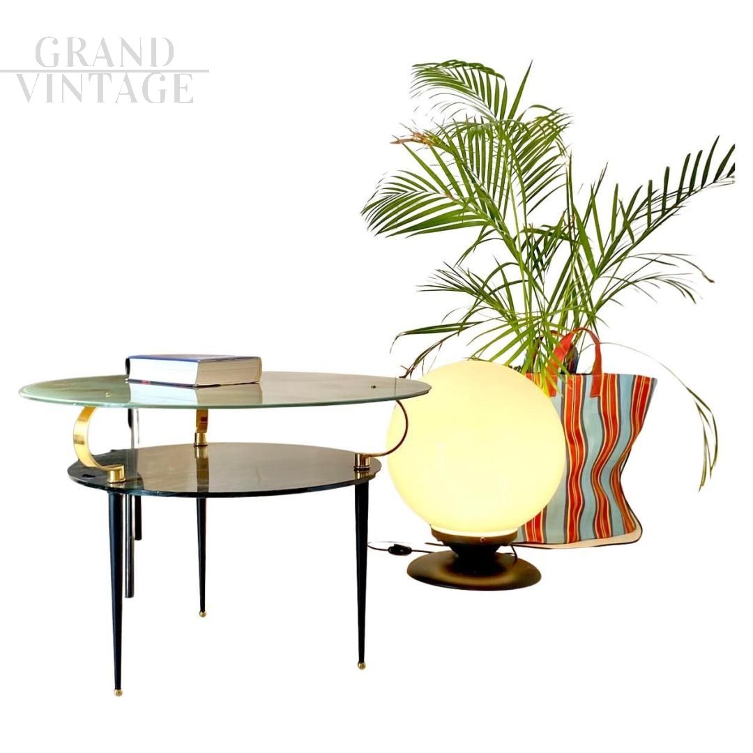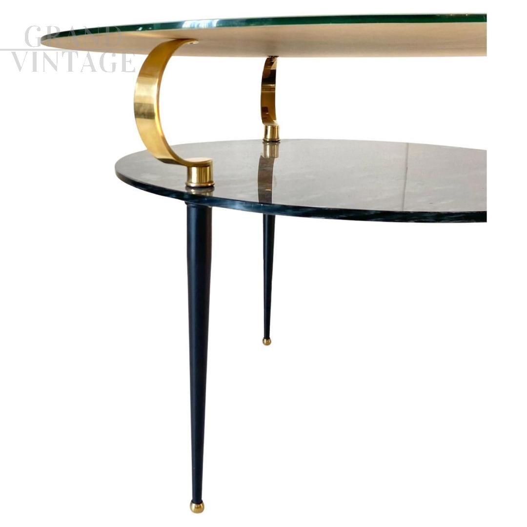 Raffinato tavolino da salotto vintage rotondo in stile Fontana Arte con doppio piano in vetro effetto marmorizzato e struttura in ottone e ferro, Italia anni '50. Raro doppio top in vetro con motivo simil marmo con raffinato braccio in ottone tra i due piani. Restaurato dal nostro team: le gambe sono state verniciate riprendendo il colore originale, l'ottone è stato lucidato. Nessuna crepa o danno sulle parti in vetro. In condizioni molto buone con solo piccoli naturali segni del tempo.