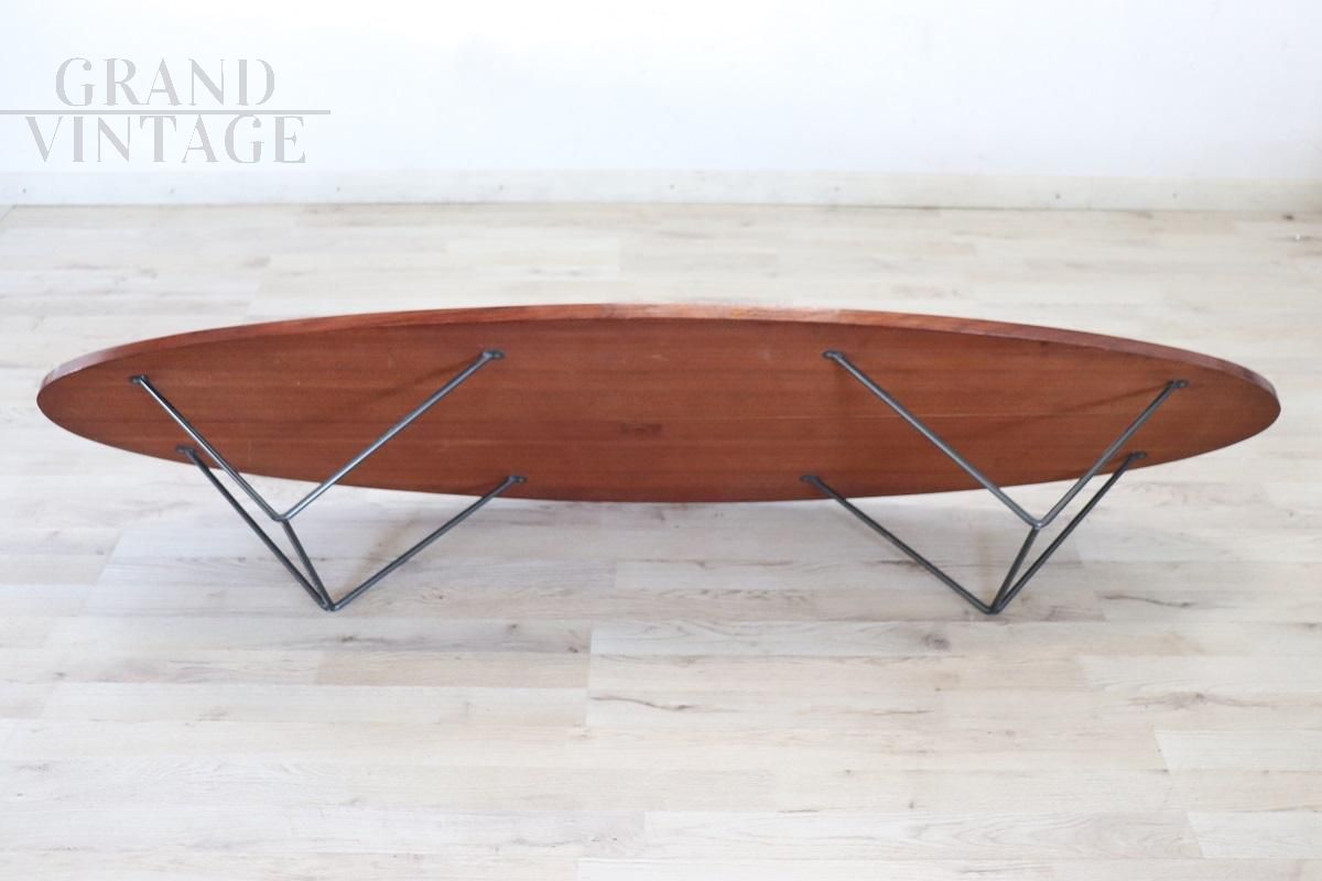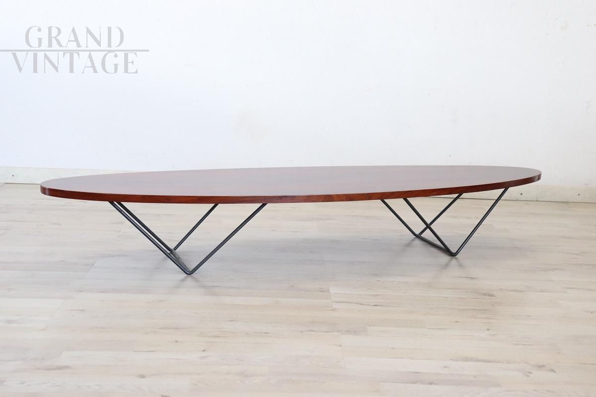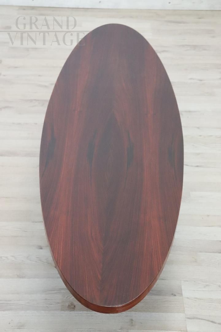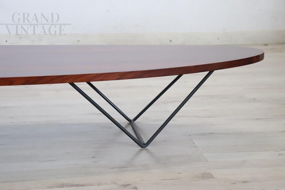Questo raffinato tavolino di metà secolo è una splendida rappresentazione del design italiano degli anni Sessanta. Realizzato con una ricca impiallacciatura di palissandro, presenta una forma ovale allungata che emana eleganza, sostenuta da gambe metalliche minimaliste che aggiungono un tocco di contemporaneità. Pur rispecchiando lo stile caratteristico del rinomato designer Augusto Bozzi per Saporiti, questo pezzo si presenta da solo, senza etichette o marchi, lasciando trasparire il suo carattere unico. Prezzo trattabile, ottime condizioni.