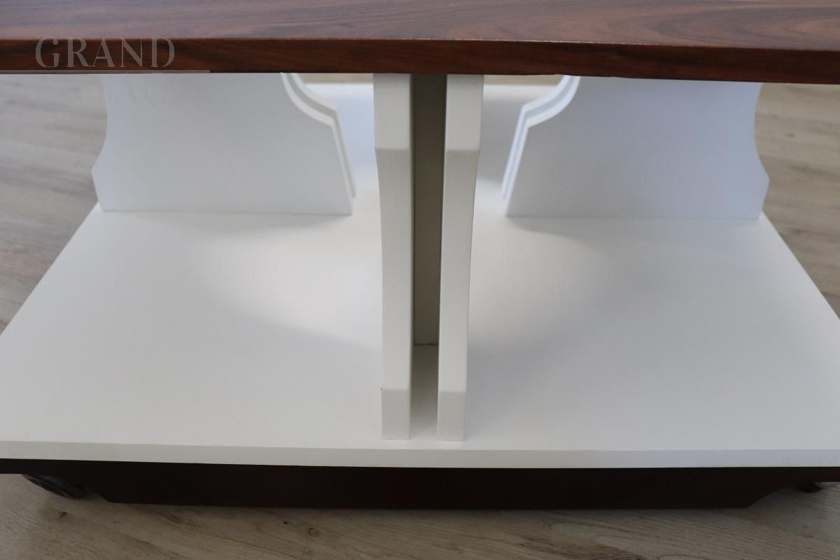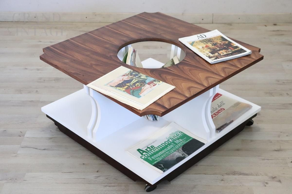 Si tratta di un pezzo d'arredamento di metà secolo XX sorprendente e sofisticato. La combinazione di impiallacciatura di noce e laccatura bianca crea un'estetica accattivante. I colori contrastanti sono un elemento chiave del suo design unico. La sua forma quadrata, che unisce estetica e funzionalità, lo rende un'aggiunta versatile a qualsiasi spazio abitativo. Ulteriori dettagli, come le nicchie nel ripiano inferiore, lo rendono pratico e offrono ulteriore spazio per riporre riviste o altri oggetti di uso quotidiano. È dotato di comode ruote per facilitare gli spostamenti quando si ricevono ospiti. Al centro del piano del tavolo, un unico scomparto aperto può essere utilizzato per le riviste o, in modo più creativo, per un vaso di fiori. Restaurato, prezzo trattabile.