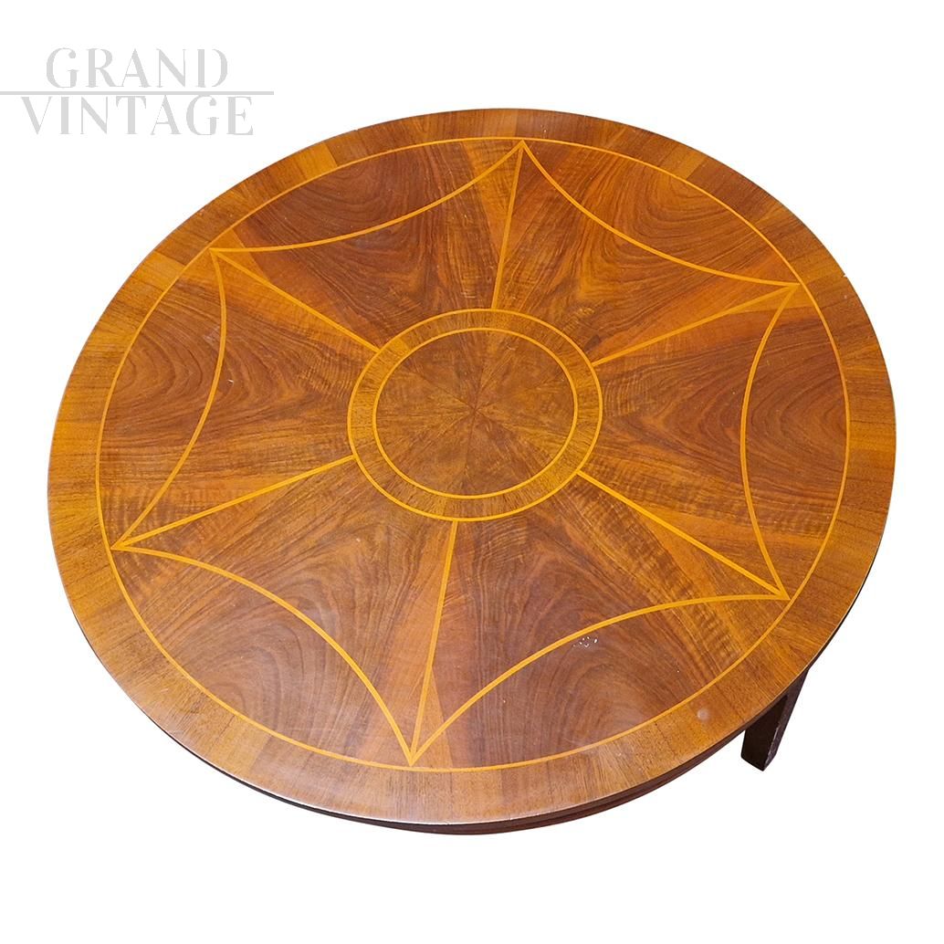 Tavolino da salotto in stile antico Luigi XVI con piano rotondo, realizzato in noce finemente decorato da filettature geometriche in bosso e acero e intarsi. Il piano e la fascia sottopiano sono sorretti da tre gambe troncopiramidali.
